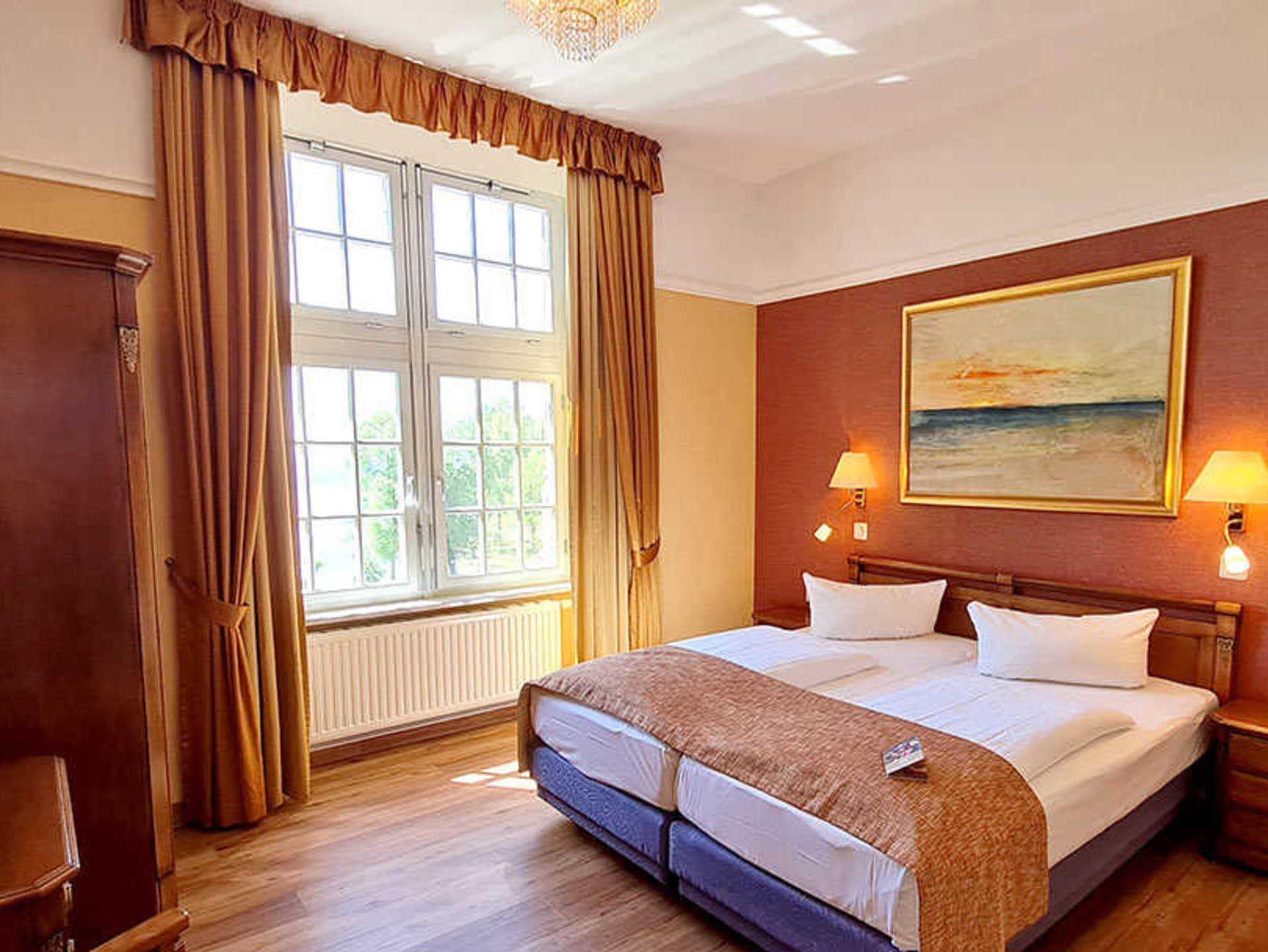 Lassen Sie sich im Schloss zwischen Türmen, Zinnen, Giebeln und den zahllosen Erkern vom Charme der Vergangenheit verzaubern oder genießen Sie mediterranes Urlaubsgefühl in der Orangerie mit ihren großzügigen Glasfassaden und warmen Akzenten. Entspannen Sie im MüritzSPA inklusive Indoor-Pool mit Seeblick, Saunen und Liegewiese . Das Schloss verfügt über Zimmer im Hauptgebäude (ohne Tiere) und in der Orangerie (Tiere teilweise), teilweise mit Balkon oder Terrasse. Alle angegebenen Preise sind ab-Preise.