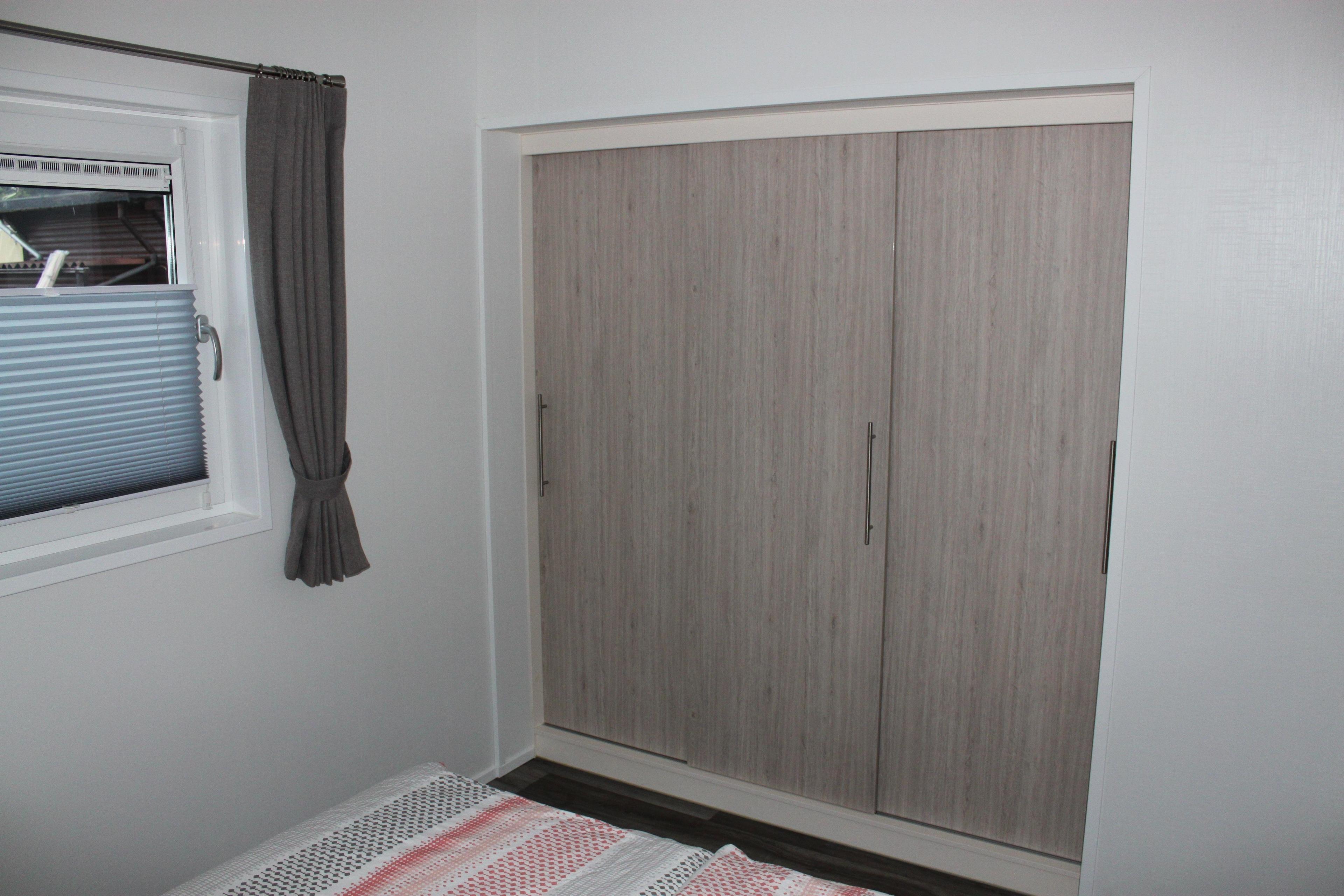 Schlafzimmer mit Doppelbett und großen, dreitürigen Schiebeschrank.