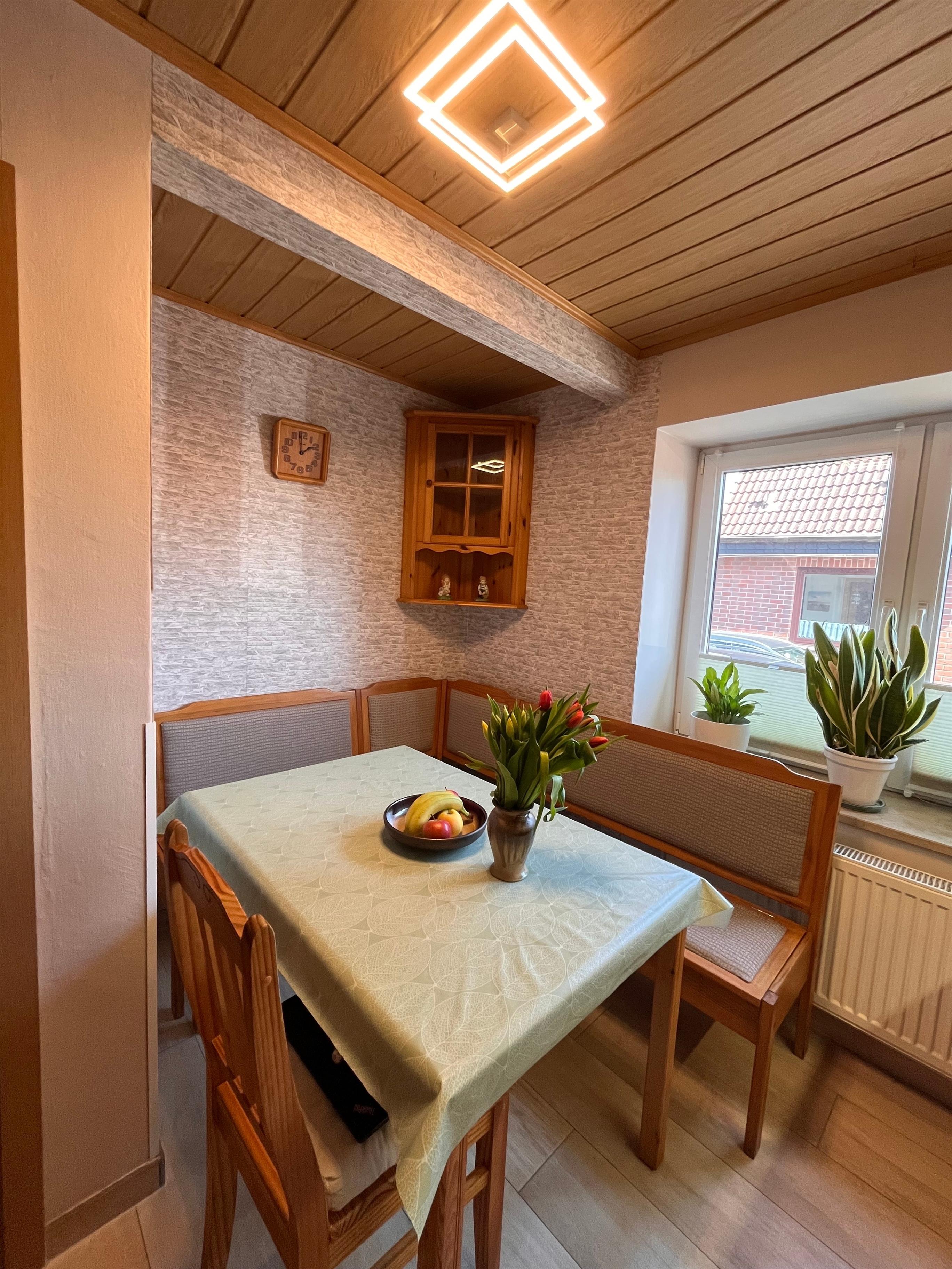 Zur Wohnung gehören auch das zweckmäßige Duschbad, sowie eine voll ausgestattete Einbauküche mit bequemer Kücheneckbank.