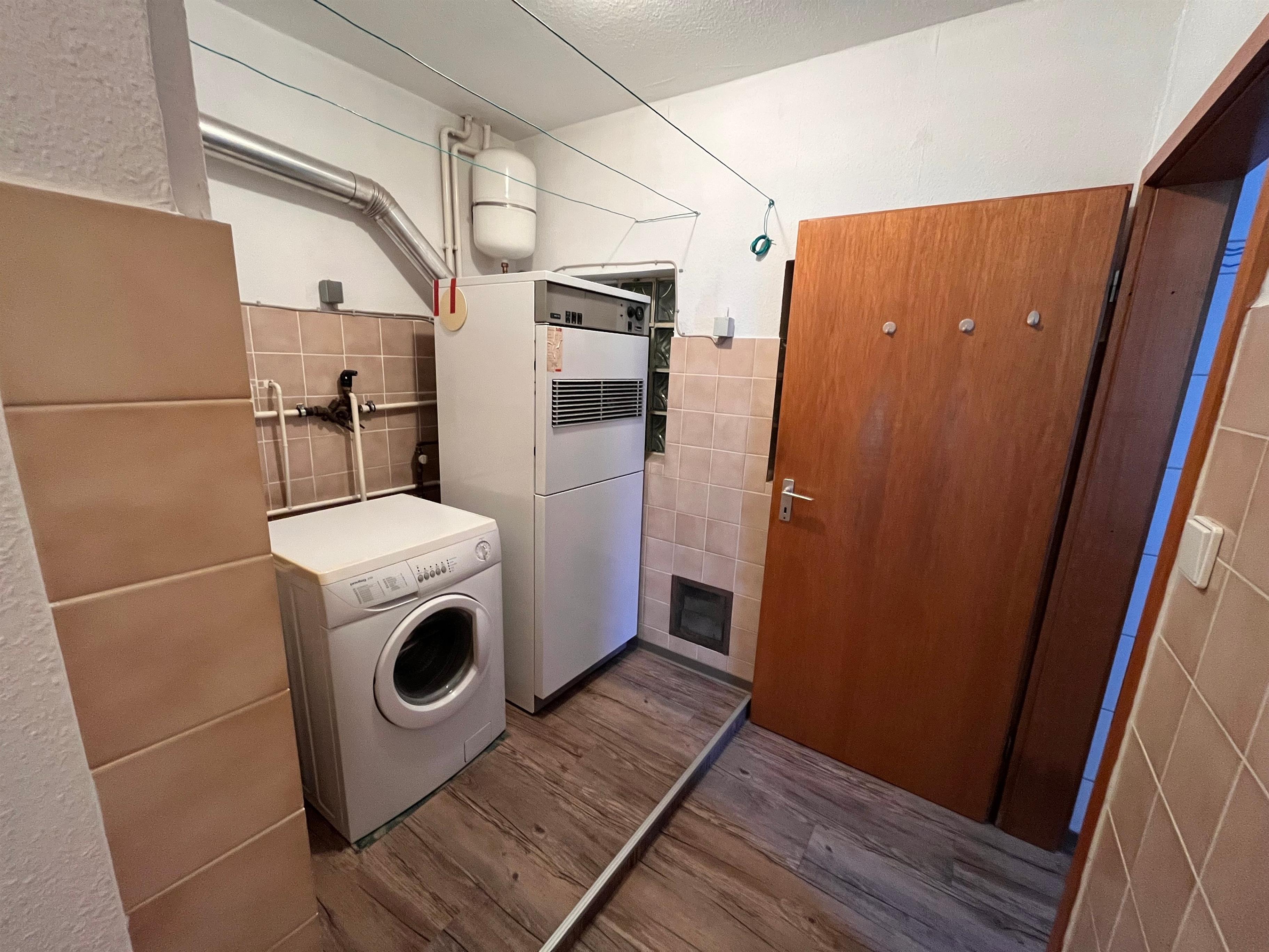 Eine Waschmaschine und eine Wäscheleine gehören ebenfalls zur Ferienwohnung.