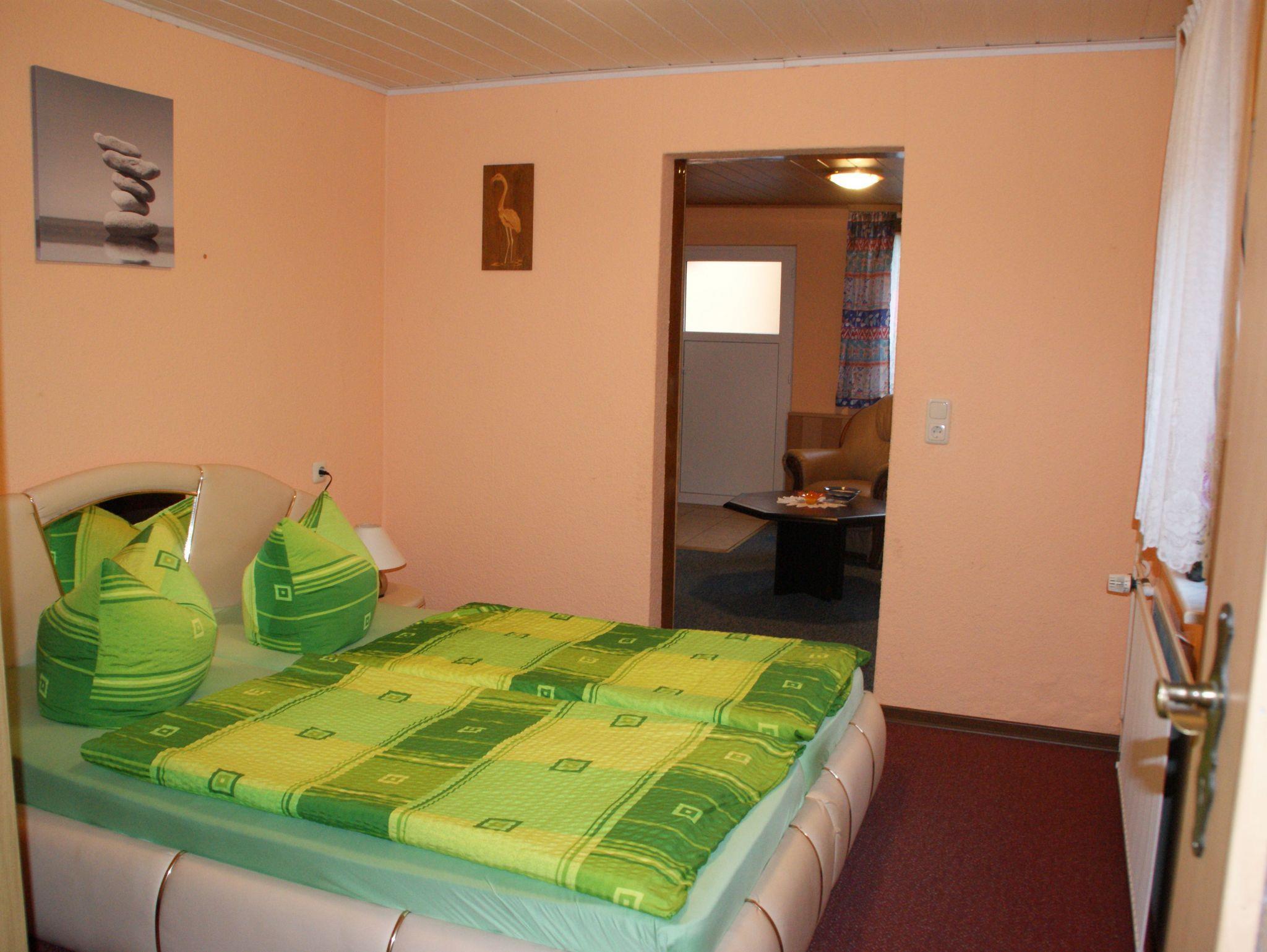 Die Ferienwohnung 2 ist ca. 43m² groß und verfügt über ein Wohnzimmer mit einem Sofa, Flat-TV und Radio. Die separate Küche ist ausgestattet mit einem Mini-Backofen, 2-Platten-Herd, Kühlschrank mit Gefrierfach, Kaffeemaschine, Toaster, Wasserkocher und mit einem Essplatz. Das große Schlafzimmer verfügt über ein Doppelbett und über einen Kleiderschrank. Im kleineren Schlafzimmer befindet sich ein kleines französisches Bett. Das Badezimmer ist mit einer Dusche ausgestattet. Vor der Wohnung befindet sich eine möblierte Terrasse. Zusätzlich finden Sie auf dem Grundstück eine überdachte Laube, die zum Grillen oder gemütlichen Beisammensein geeignet ist.
