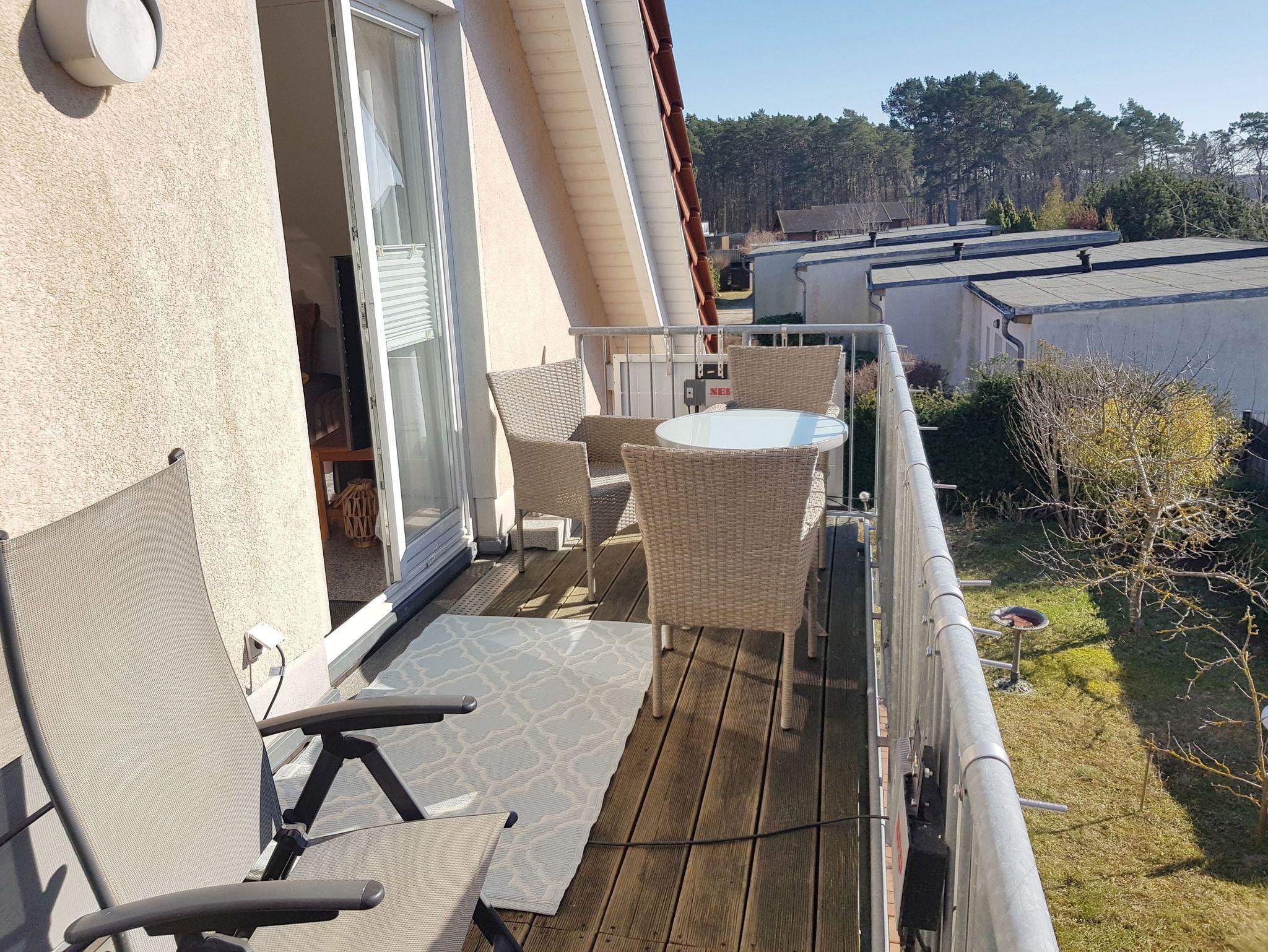 Chices neues Ferienhaus mit sehr hellen, modernen Räumen. Gesamtes Obergeschoss mit separatem Eingang (Doppelhaushälfte mit großer Diele im EG) und Balkon mit freiem Wasserblick. Herrlicher Weitblick aufs Achterwasser und ins Grüne vom Wohnzimmer, Schlafzimmer und Balkon. Der großzügige Balkon ist mit einem Strandkorb, einer Sitzecke, Relaxsessel und einer Bäderliege ausgestattet. Der windgeschtzte Balkon ist nach Süden und Westen orientiert.