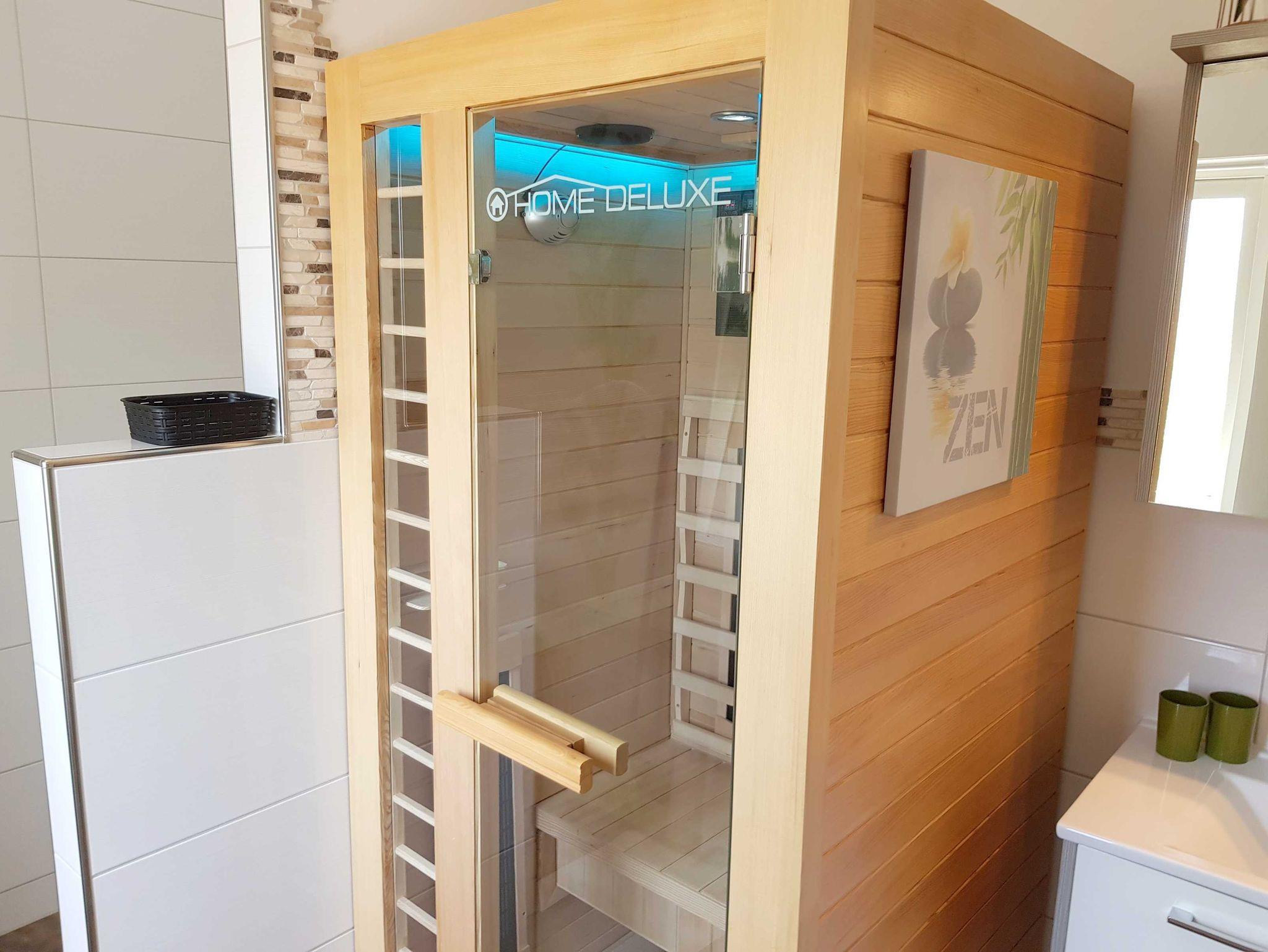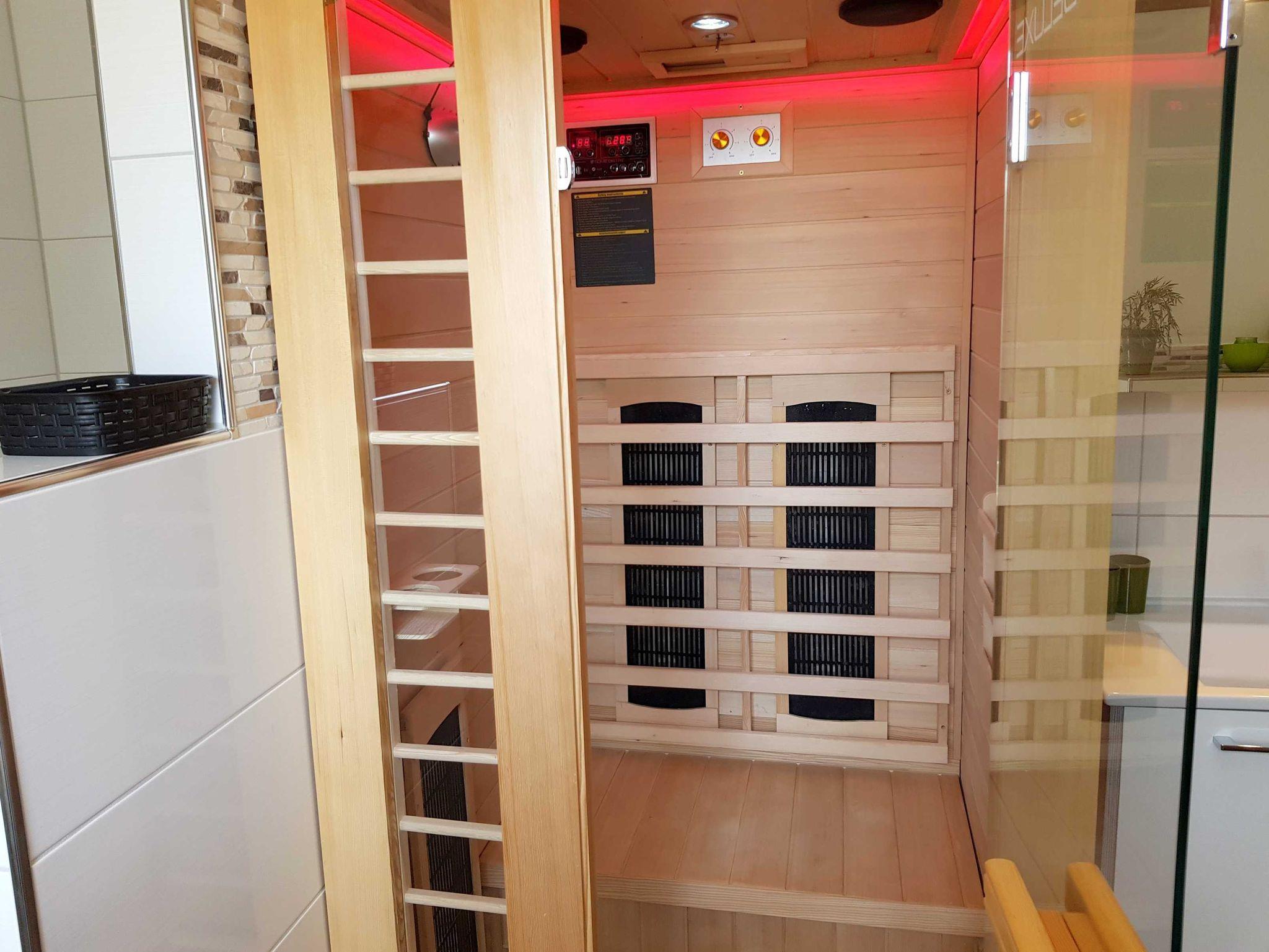 Eine Infrarotkabine mit Farblichtanwendung im Bad sorgt für wohltuende Entspannung. Die Kabine mit großer Glasfront verfügt über 4 Vollspektrumstrahler und 1 Karbonflächenstrahler im Boden. Die Ausstattung wird durch einen Ionisator und ein FM-Radio mit MP3, USB-Anschluss, Bluetooth komplettiert.
