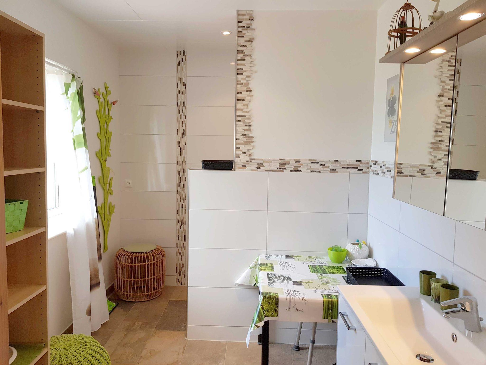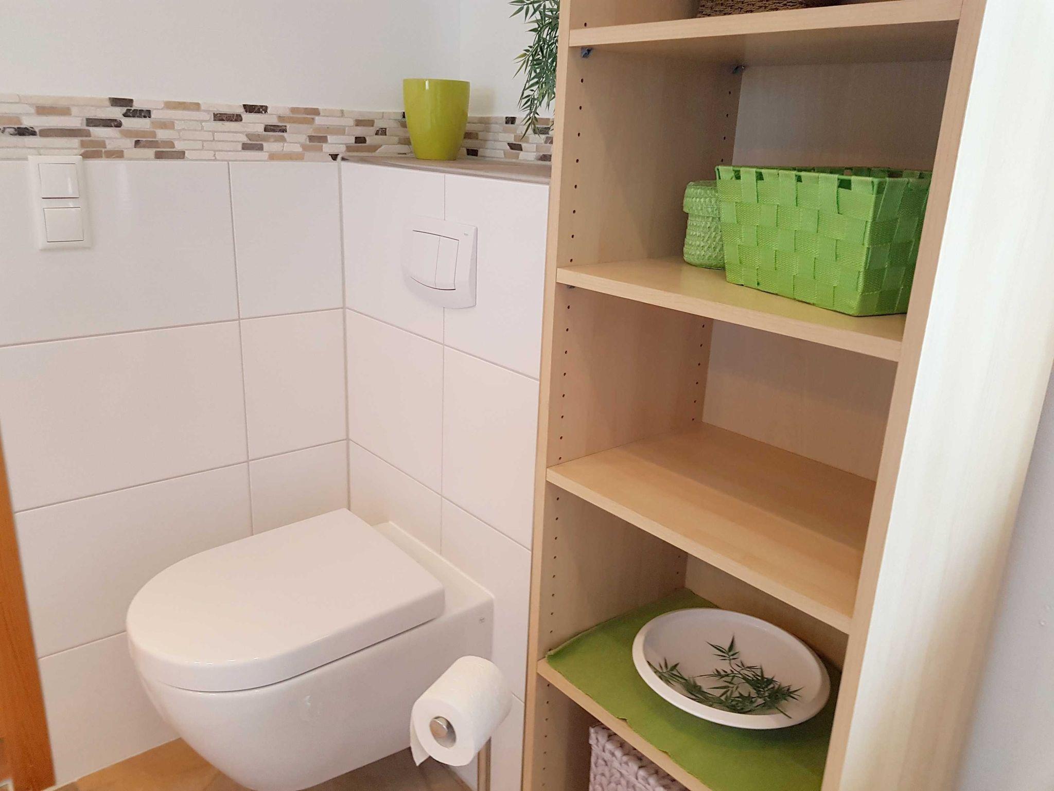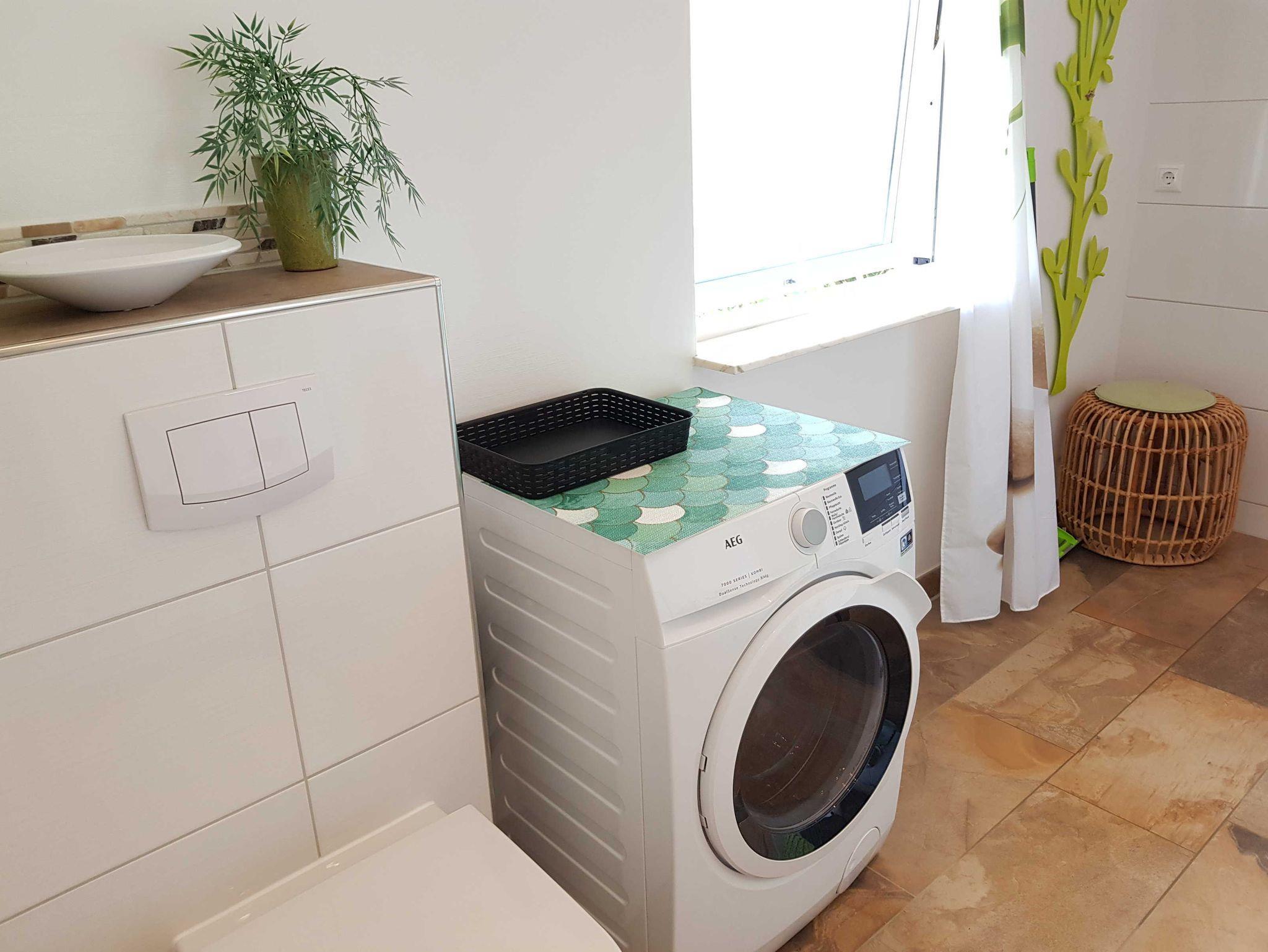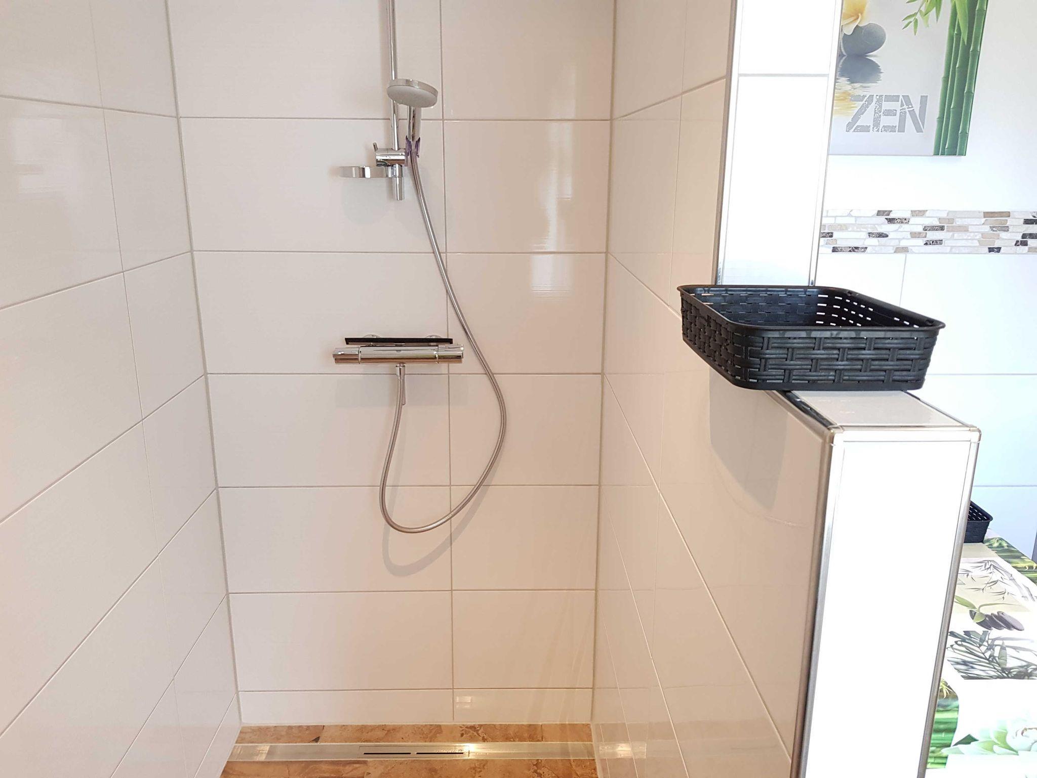 Das als Wellness-Oase gestaltete, geräumige Bad verfügt über eine bodengleiche, geflieste Walk-In Dusche mit Duschrinne - besonders komfortabel. Zudem verfügt es über eine hochwertige Ausstattung wie einem WC mit antibakterieller Beschichtung und Duscharmatur mit Thermostat. Die Dusche ist mit 1 m Breite besonders geräumig. Die rutschgehemmten Fliesen im gesamten Bad sorgen für ein sicheres Begehen. Außerdem steht ein Waschtrockner für Sie bereit.