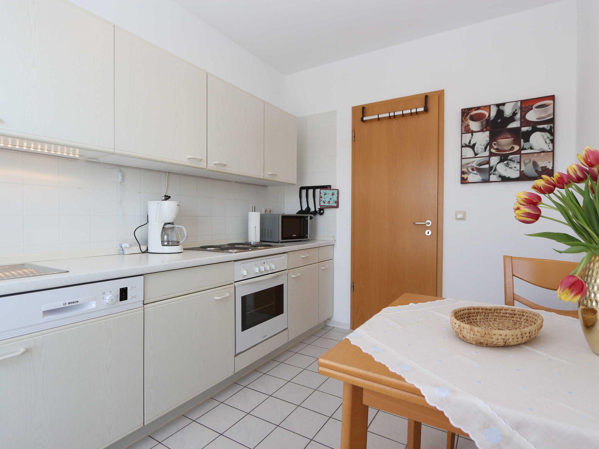 • komplett eingerichtete Einbauküche mit Herd, Spülmaschine, Mikrowelle, Kühlschrank mit Gefrierfach, Toaster, Kaffeemaschine, Wasserkocher, Eierkocher, reichlich Geschirr und Essplatz