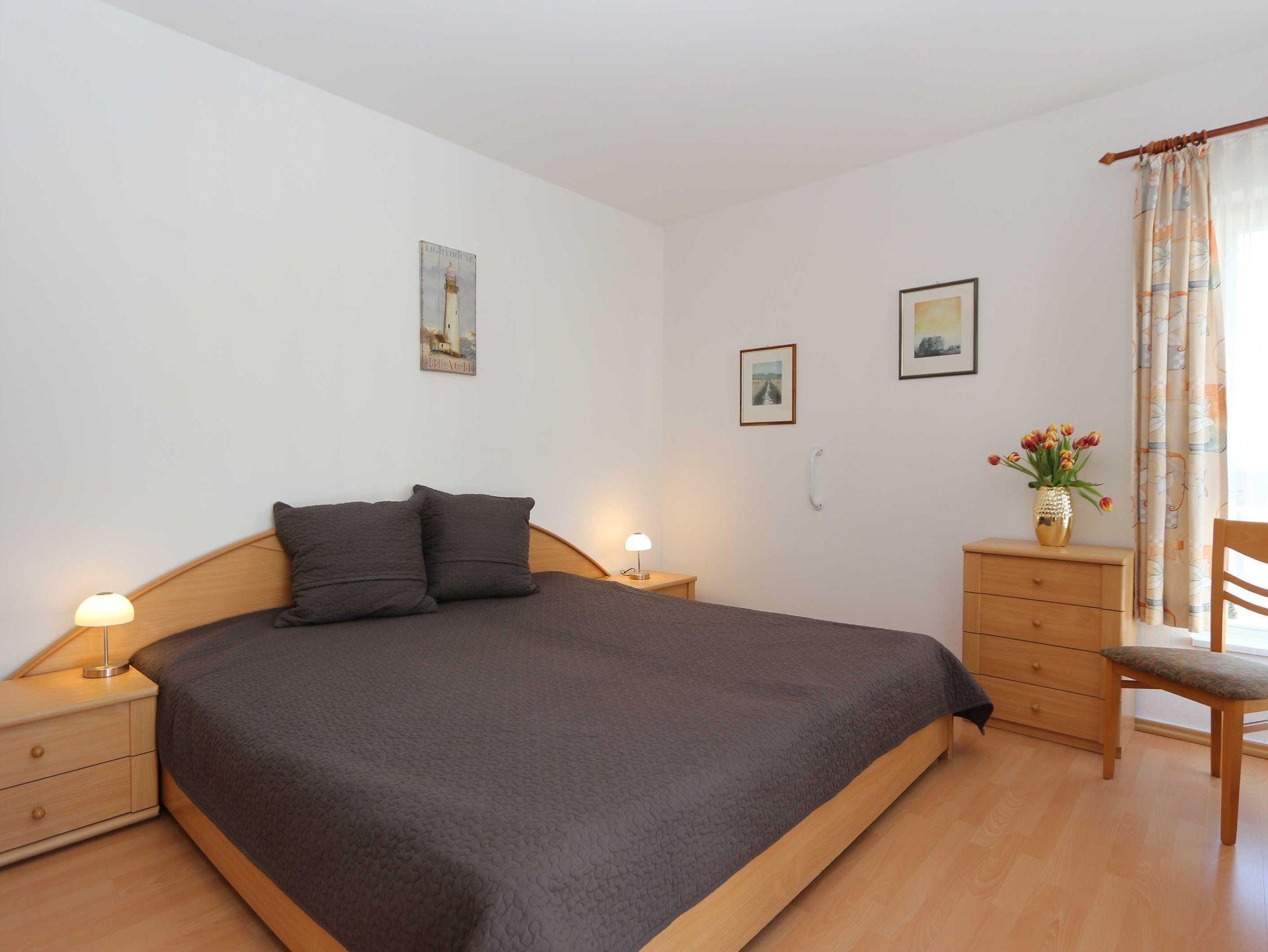 • Schlafzimmer mit Doppelbett für 2 Personen, Kleiderschrank. Kommode, Radiowecker und Zugang zum Balkon.