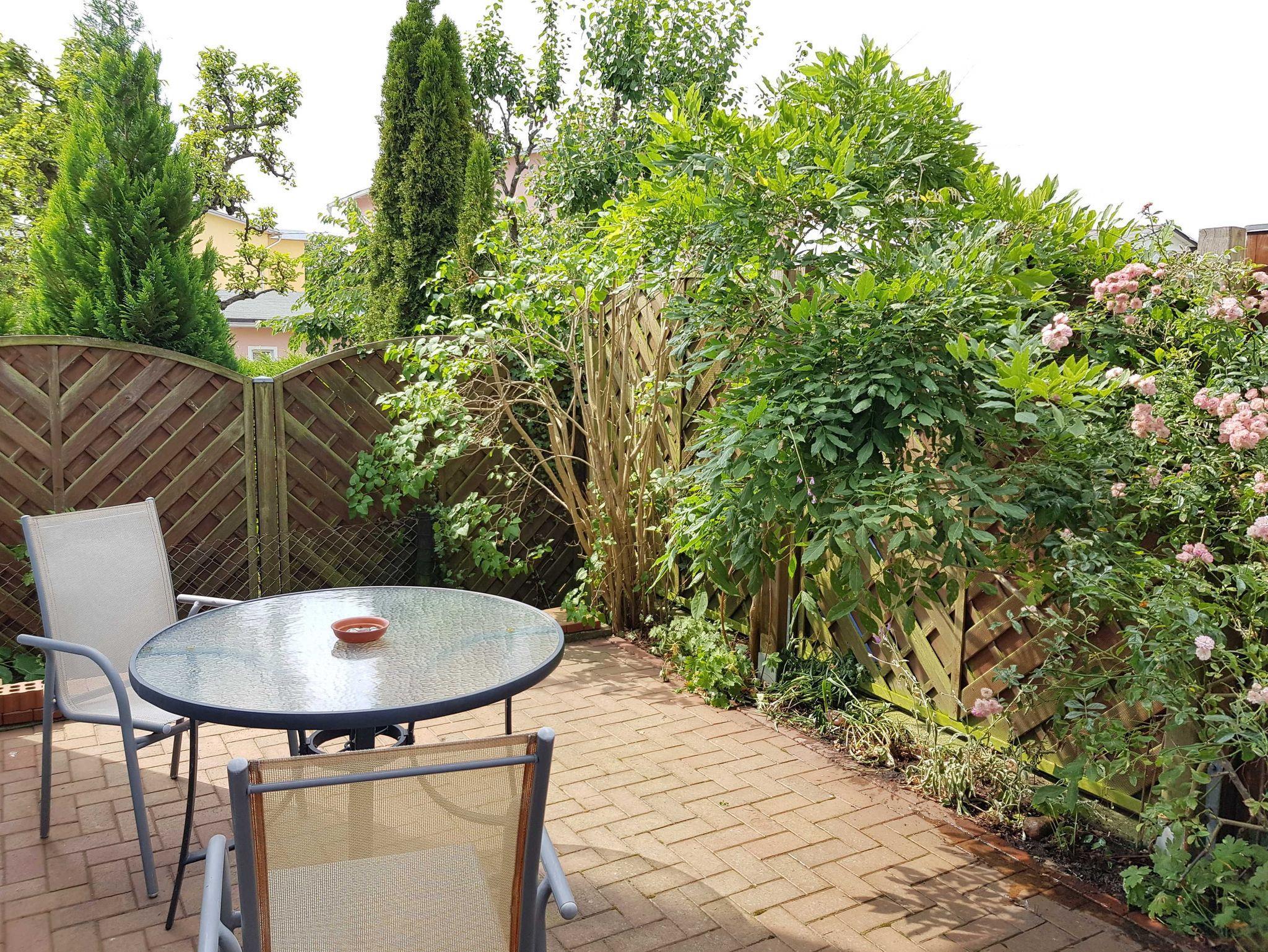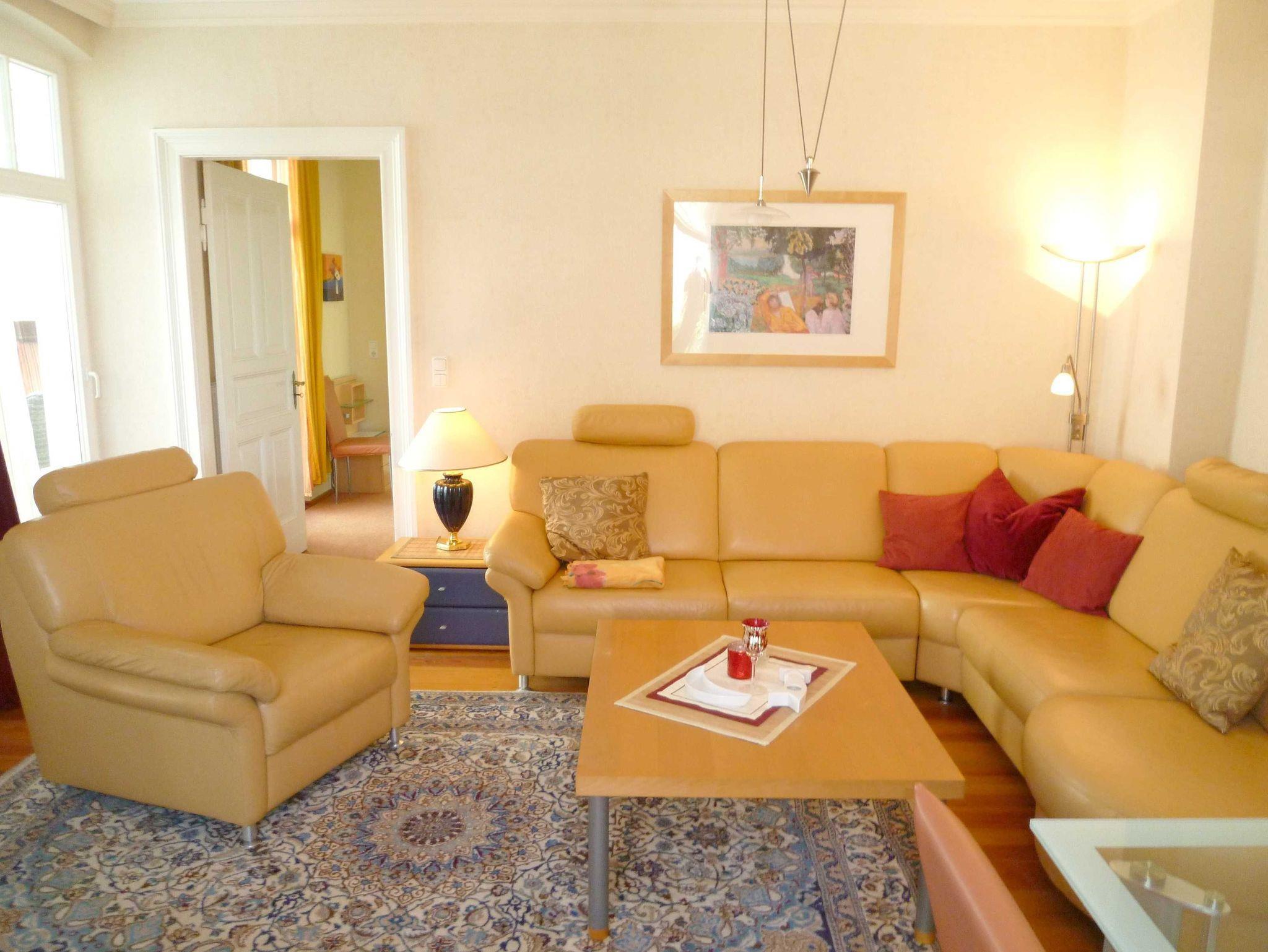 Das Highlight ist der sehr große Wohnwintergarten. Er ist nach Osten orientiert, deshalb ist die Raumtemperatur auch im Sommer immer ideal. Zwei große Schiebetüren lassen sich zum schönen alten Garten mit vielen Bäumen öffnen, deshalb lebt man mitten im Garten und kann die gesunde Seeluft genießen. Außerdem bietet er, weil er voll beheizbar ist, zu jeder Jahreszeit einen herrlichen Platz im Grünen. Die hochwertige Ausstattung wird durch einen Strandkorb und Fernseher komplettiert. Die schönen Wohnräume mit Stuckdecken sind alle vom Wintergarten aus begehbar.