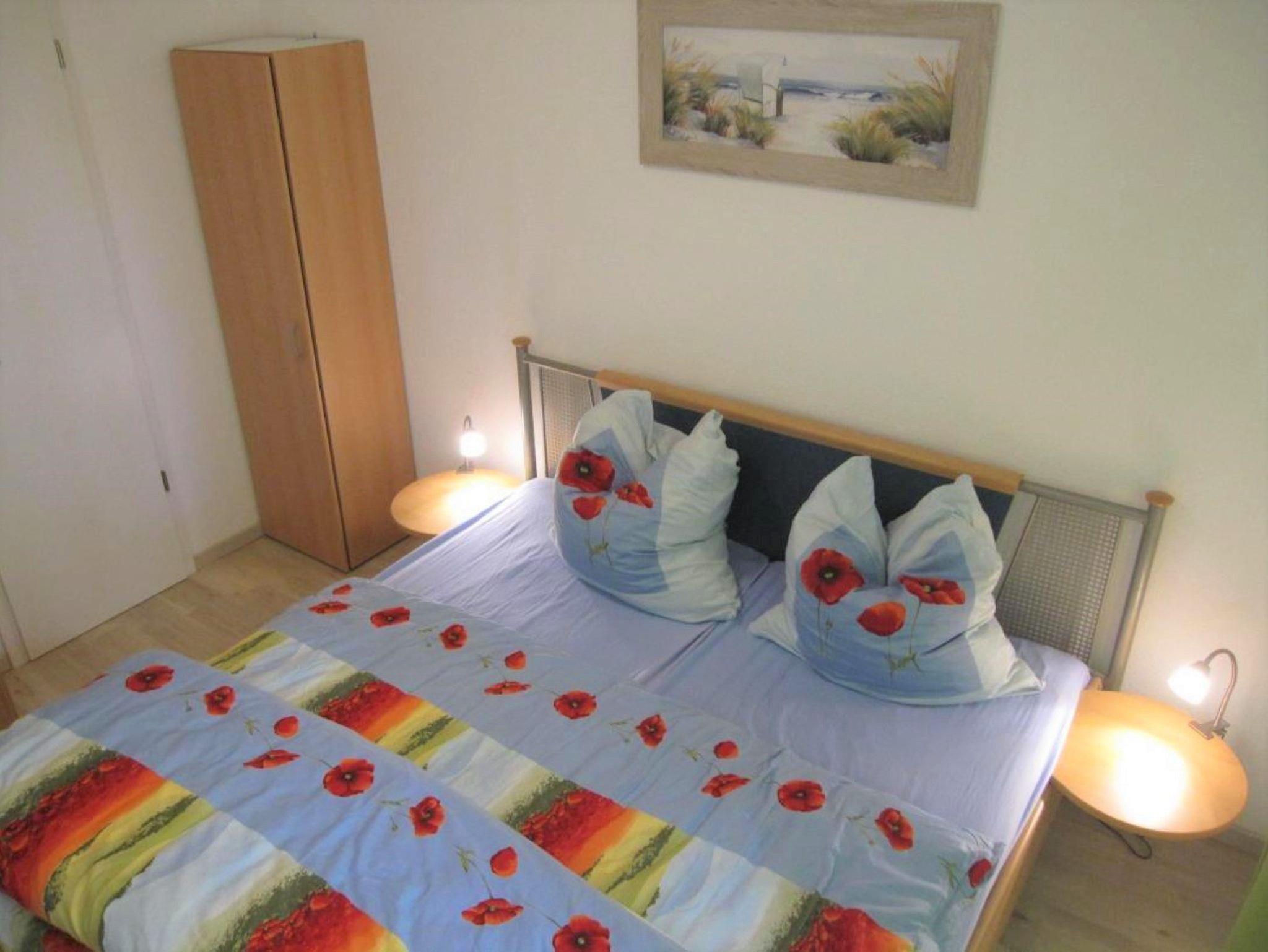 Die Ferienwohnung verfügt über ein Wohnzimmer mit FLAT-TV, Radio, WLAN und offener Einbauküche mit Backofen, Geschirrspüler, Kühlschrank mit Tiefkühlfach, Mikrowelle, Kaffeemaschine, Wasserkocher und Toaster. Das separate Schlafzimmer ist mit einem Doppelbett und Kleiderschrankwand ausgestattet. Das Badezimmer verfügt über Dusche/WC und Haartrockner. Vom Wohnzimmer aus gelangen Sie auf den Balkon mit seitlichen Meerblick.