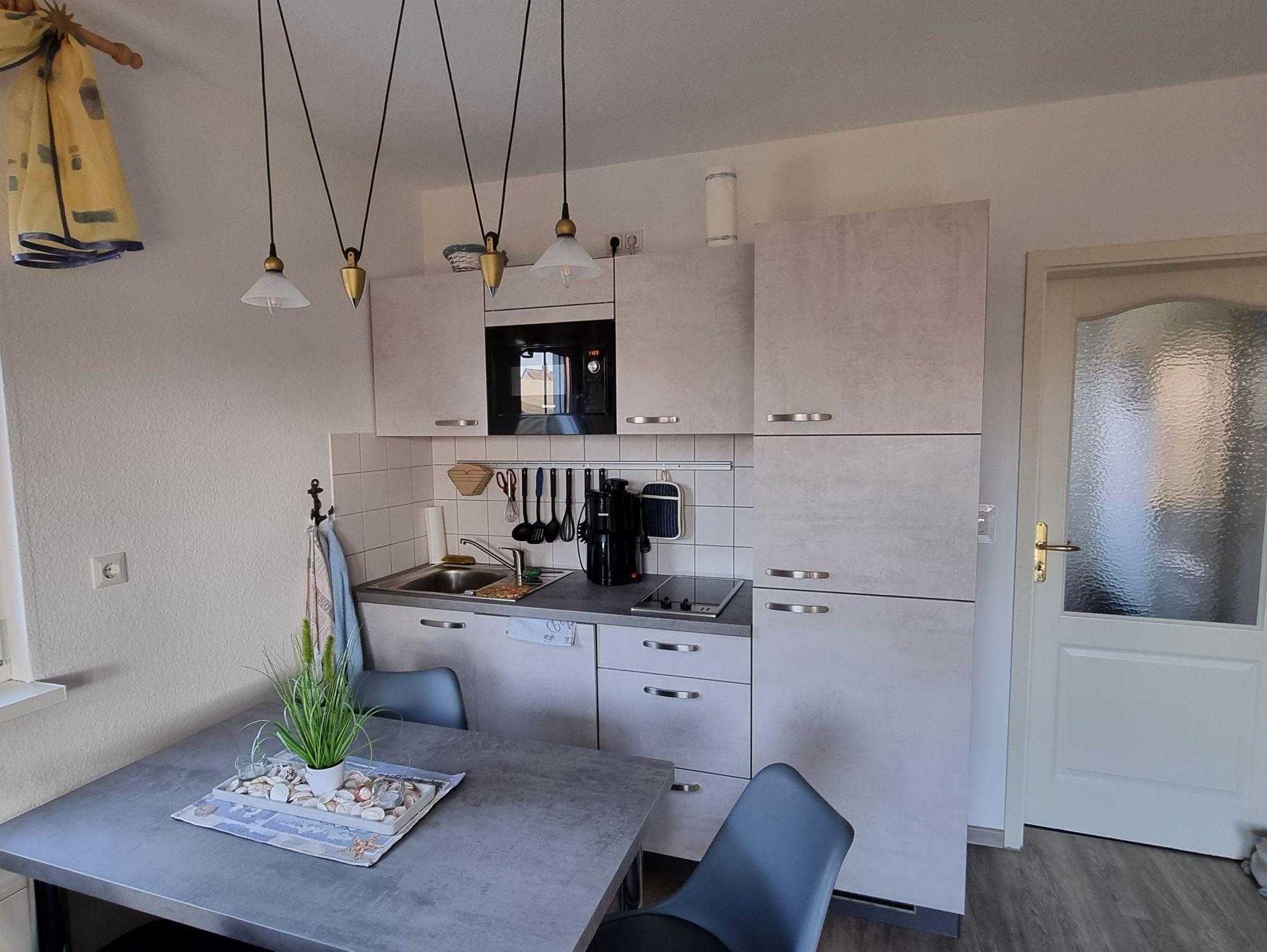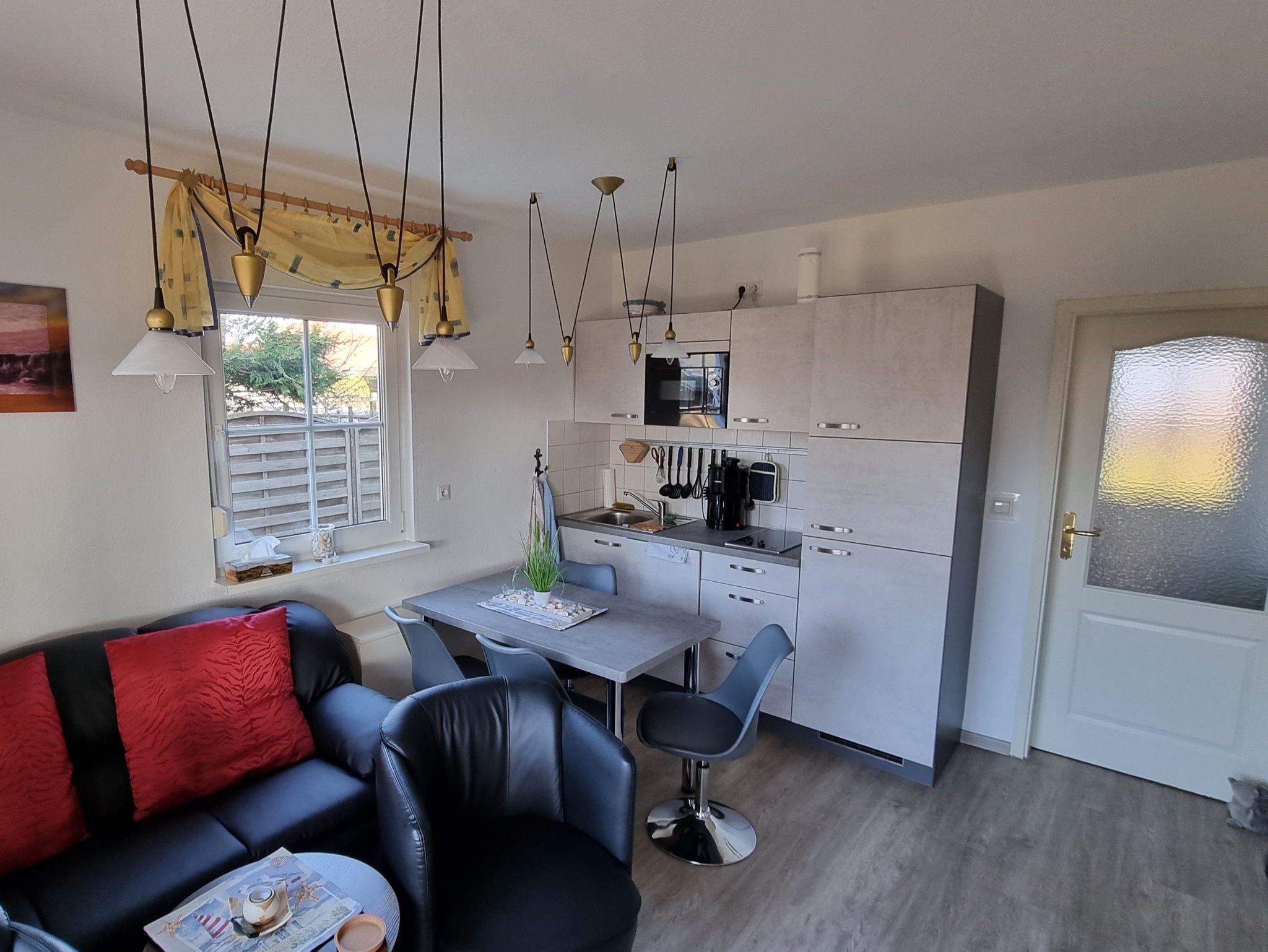 Schöne 3-Zimmer Ferienwohnung in einer freundlich angelegten Ferienanlage. Die Ferienwohnung ist im Wohnbereich ausgestattet mit einer gemütlichen Couch und einer offenen Küche mit Essbereich.