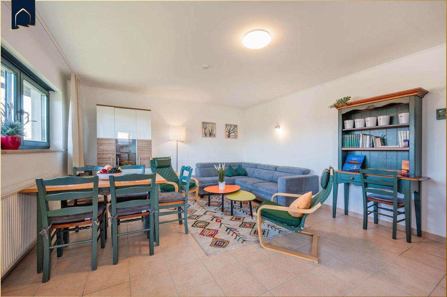 Die Ausstattung lässt keine Wünsche offen: WLAN, Flachbild-TV mit DVD-Player, Spülmaschine, Mikrowelle, Backofen, Kaffeemaschine, Waschmaschine und vieles mehr stehen zur Verfügung. Auf dem Balkon kannst du nach einem erlebnisreichen Urlaubstag entspannen – mit Blick ins Grüne oder bei einem Glas Wein den Abend genießen. Kinder sind herzlich willkommen, ein Babybett ist vorhanden, und auch Vierbeiner dürfen mitgebracht werden.