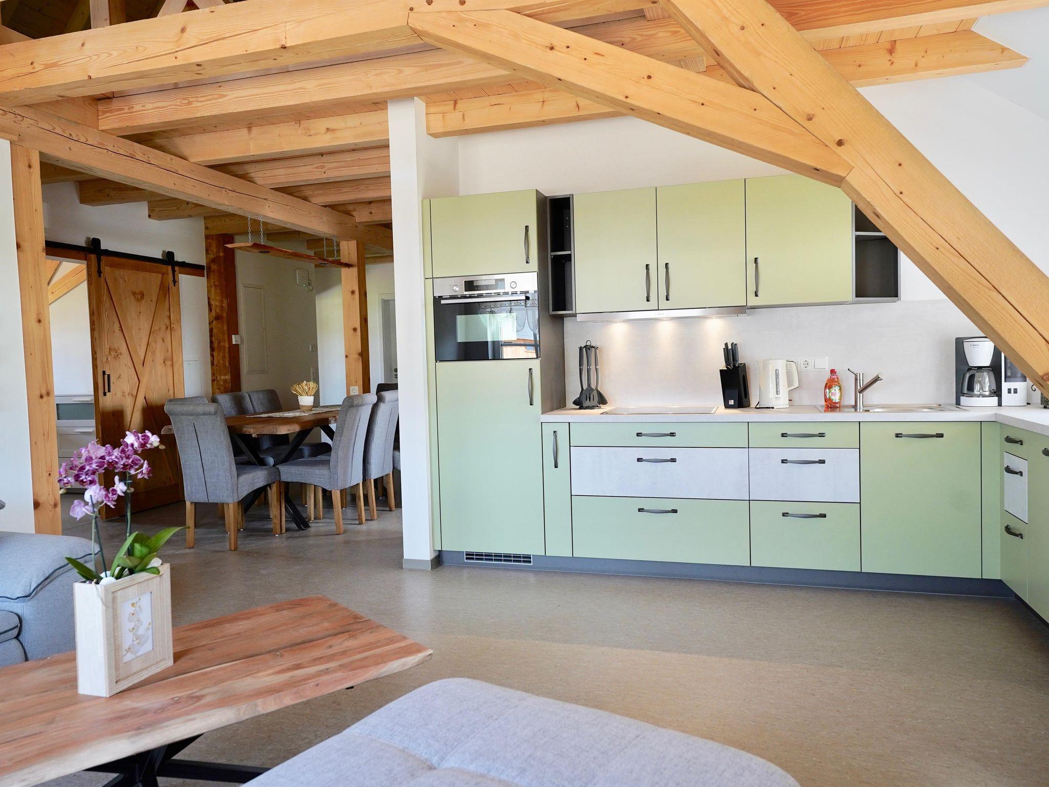 Unsere komfortable Ferienwohnung „Spitzberg“ verfügt über eine vollausgestatte Wohnküche sowie einen Esstresen. Das Badezimmer ist mit einer großen Dusche, einem WC und Waschtischschrank sowie beleuchtetem Spiegel ausgestattet. Im Schlafzimmer erwartet euch ein bequemes Doppelbett, es ist auch genügend Platz um ein Babybettchen reinzustellen. Besonders macht diese Ferienwohnung, die liebevoll angebrachte Holzbalkendecke welche es warm und gemütlich anheimeln lässt. Außerdem verfügt die Wohnung über einen Balkon mit ruhiger Lage zur Hofinnenseite gelegen. Dort genießt ihr die Morgensonne in vollen Zügen. In unseren Ferienwohnungen sind außerdem der Bettwäsche- und Handtuchservice sowie der Kaffee und eine kleine Tee-Auswahl in den Küchen, als Service inbegriffen. Eine Flasche Mineralwasser als Begrüßungsgetränk und die Endreinigung nach dem Check Out gehören ebenfalls standardmäßig zu unserem Service.
