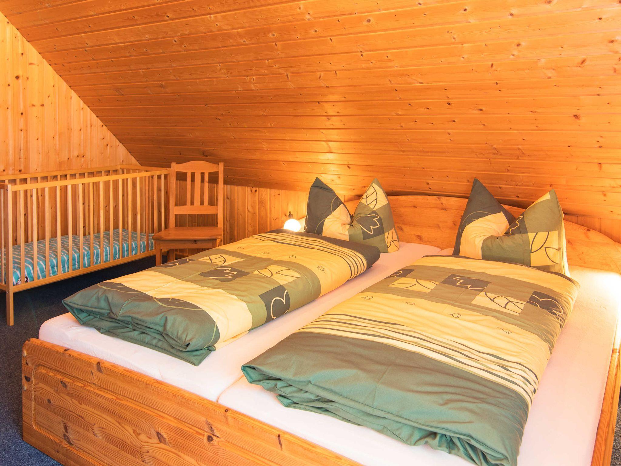 Im Obergeschoss stehen zwei Schlafzimmer zur Verfügung. Das erste Schlafzimmer ist mit Doppelbett (180x200), Babybett, genügend Stauraum und einem Schreibtisch ausgestattet. Das zweite Schlafzimmer verfügt über zwei Einzelbetten (90x200) und einen Kleiderschrank.