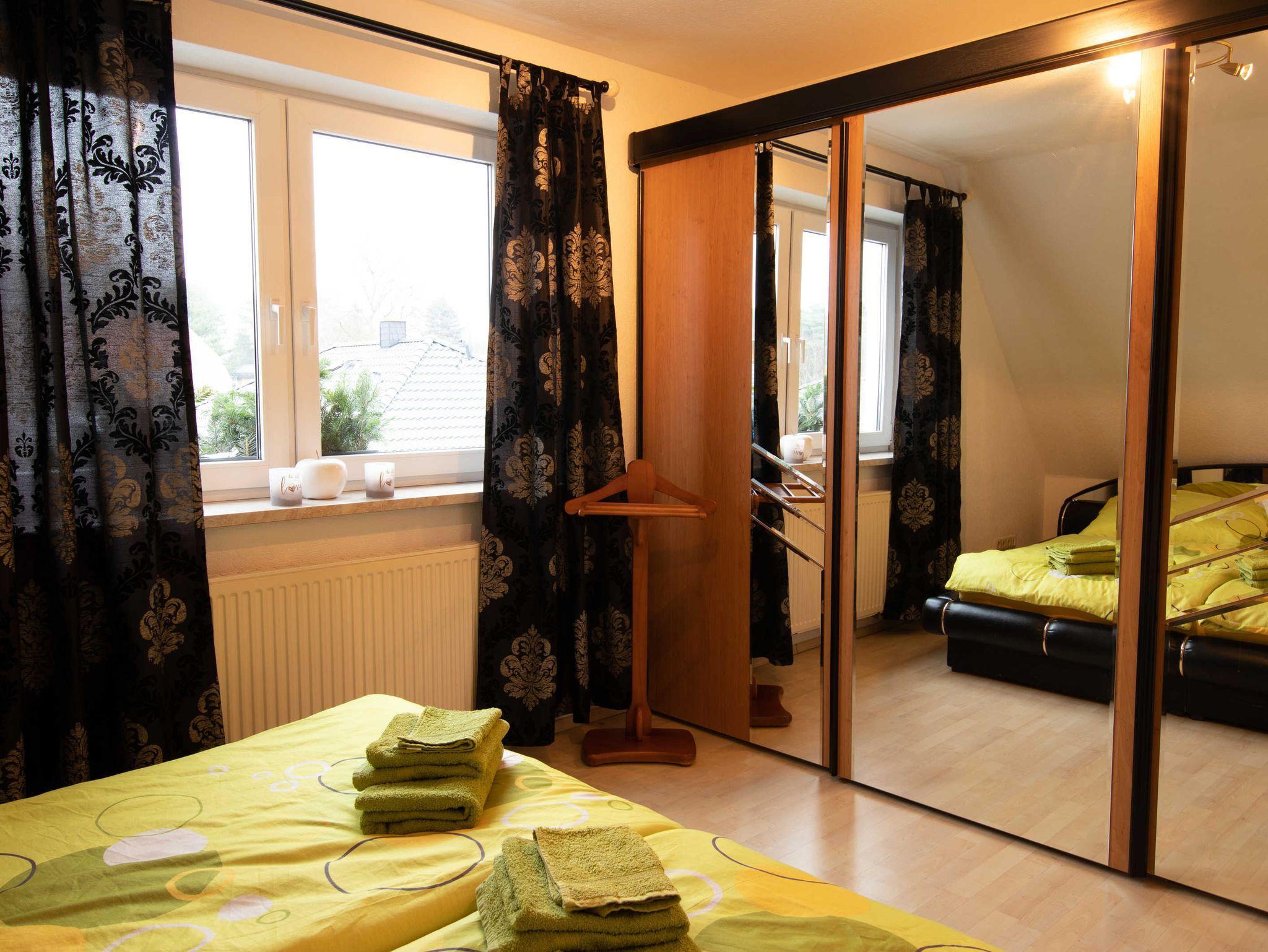 Die 80 m² große 3-Raumferienwohnung befindet sich im Obergeschoss eines Wohnhauses am Ortsrand von Freest. Sie verfügt über ein Wohnzimmer mit Balkon, 2 Schlafzimmer, eine separate Küche sowie ein Bad mit Dusche und WC. Das Wohnzimmer ist mit Schlafsofa (160x200) und TV gemütlich eingerichtet. Ein Schlafzimmer ist mit einem Doppelbett (180x200) und Kleiderschrank, das andere Schlafzimmer mit Doppelbett (180x200) und Kommode eingerichtet. Die separate Küche ist umfangreich ausgestattet mit Esstisch, Spülmaschine, Backofen, Cerankochfeld, Mikrowelle, Kühlschrank mit Gefrierfach, Wasserkocher und Kaffeemaschine. Das geräumige Bad verfügt über Waschbecken, Dusche und WC.