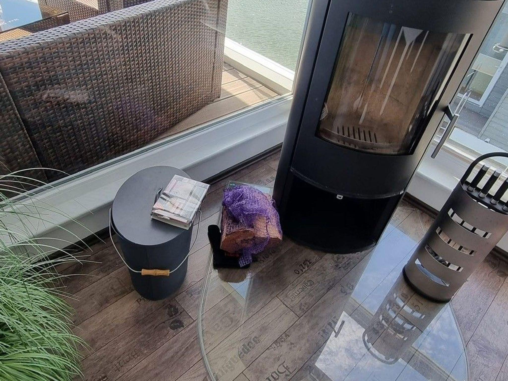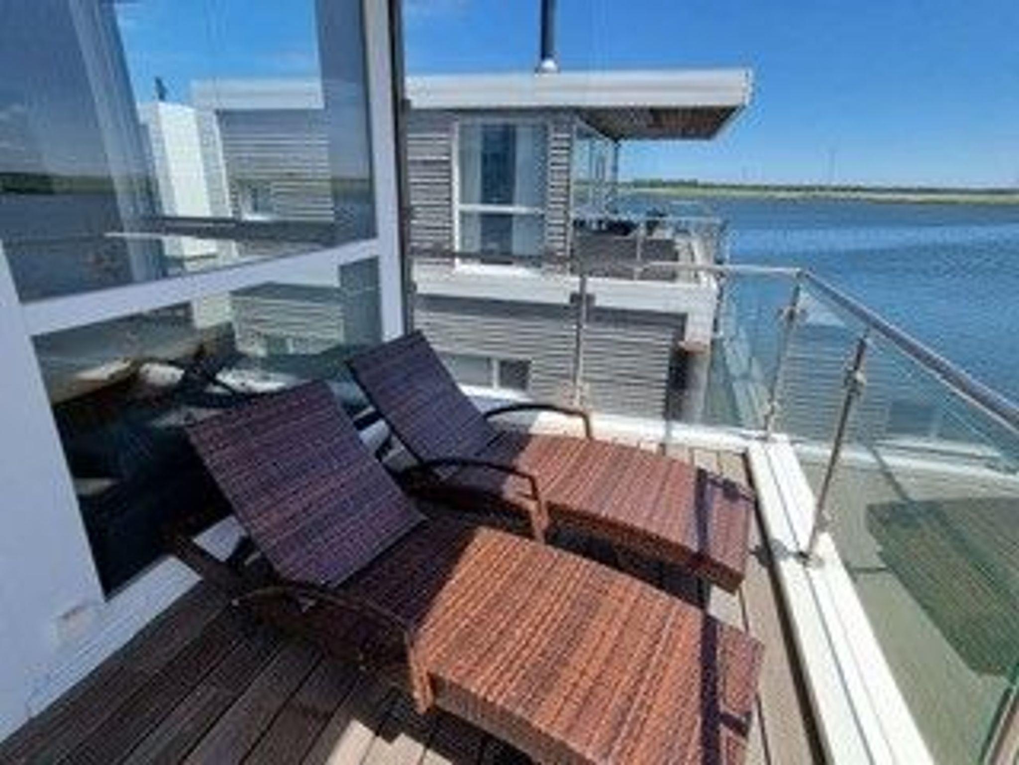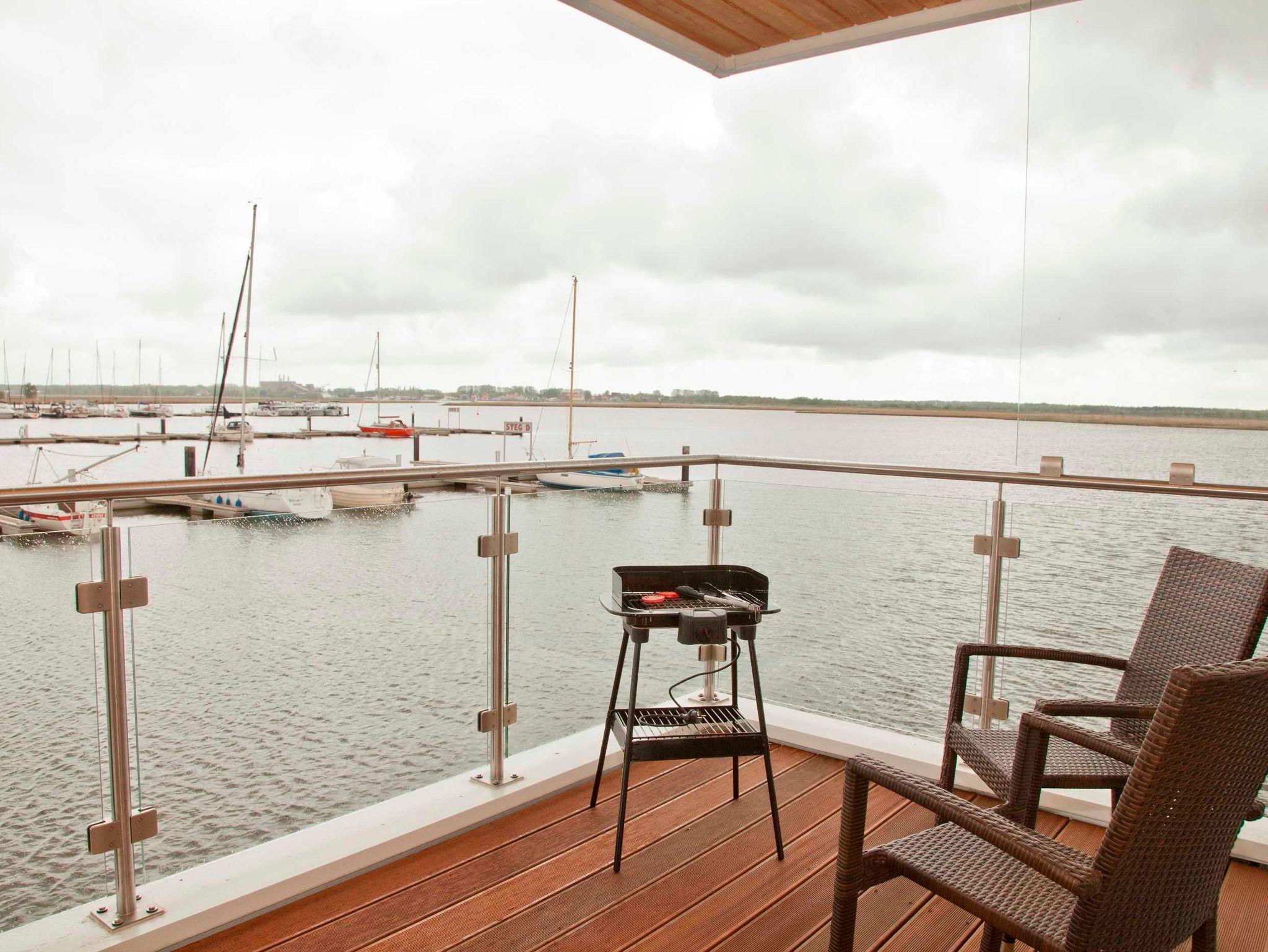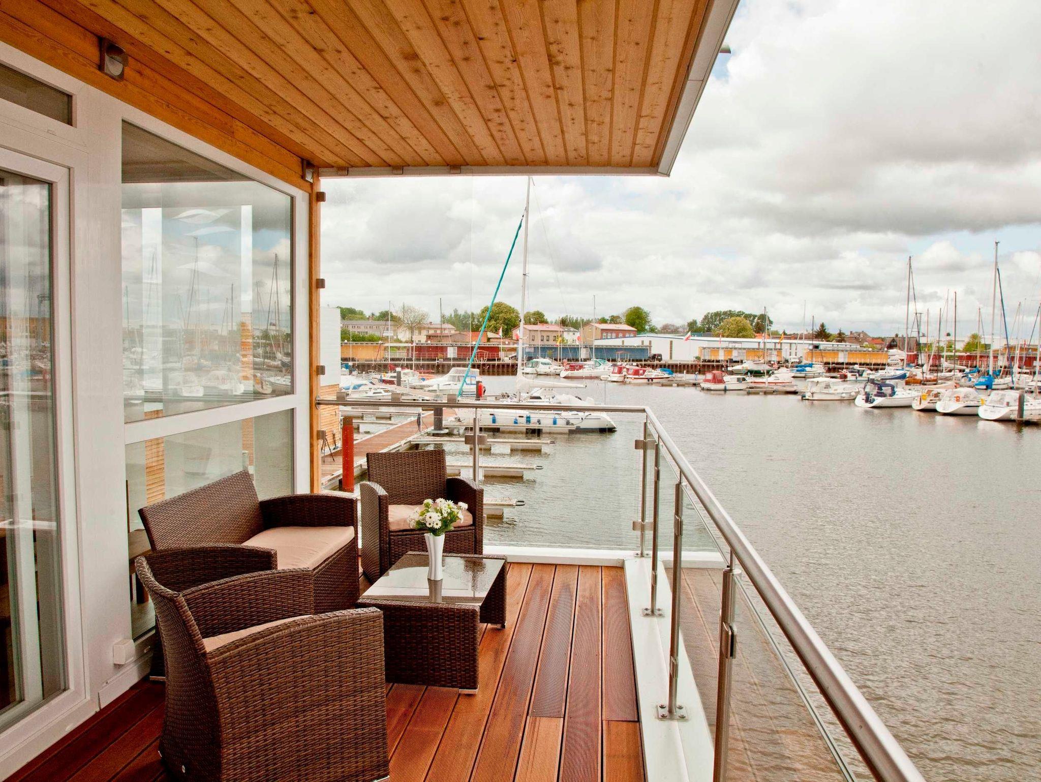 Erleben Sie luxuriöse Entspannung in einem modernen Floating House mit Kamin und Panoramablick bei Marina Kröslin.