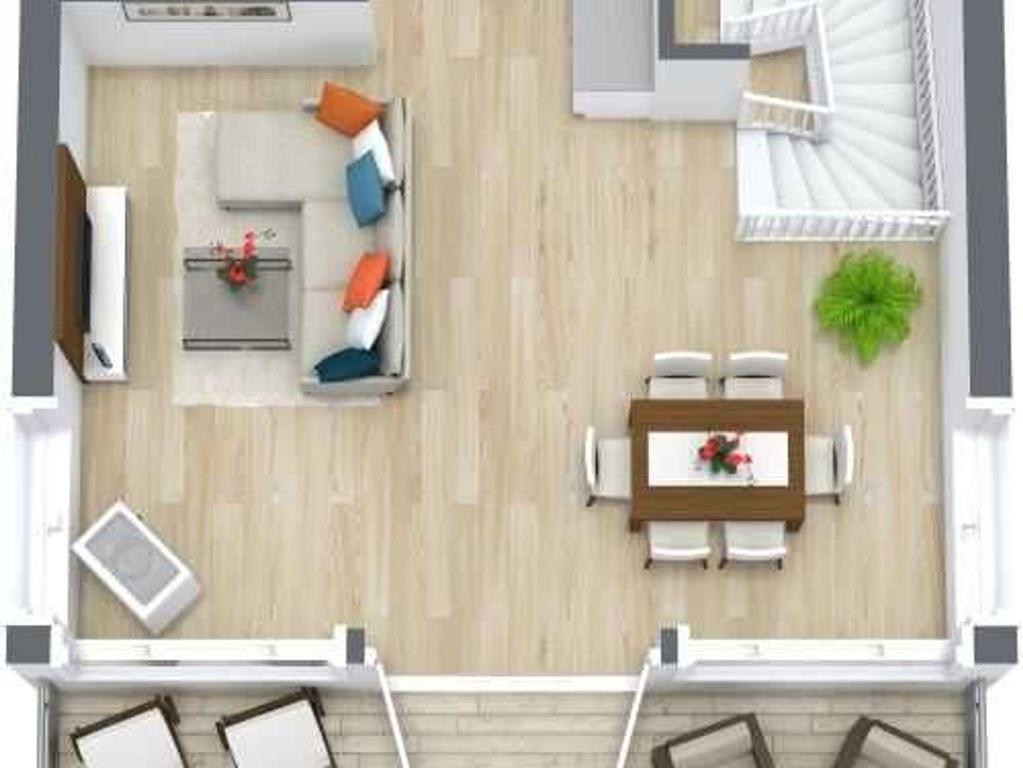 Der lichtdurchflutete Wohnbereich mit Zugang zur Sonnenterrasse, sowie der Küchenbereich und ein separates WC befinden sich in der oberen Etage.