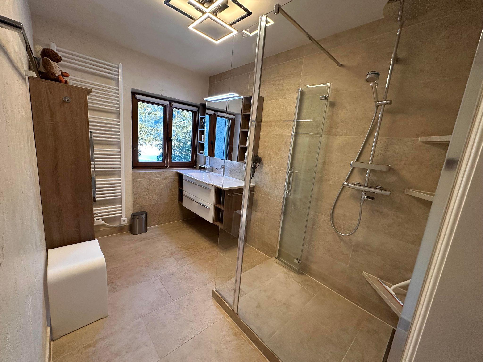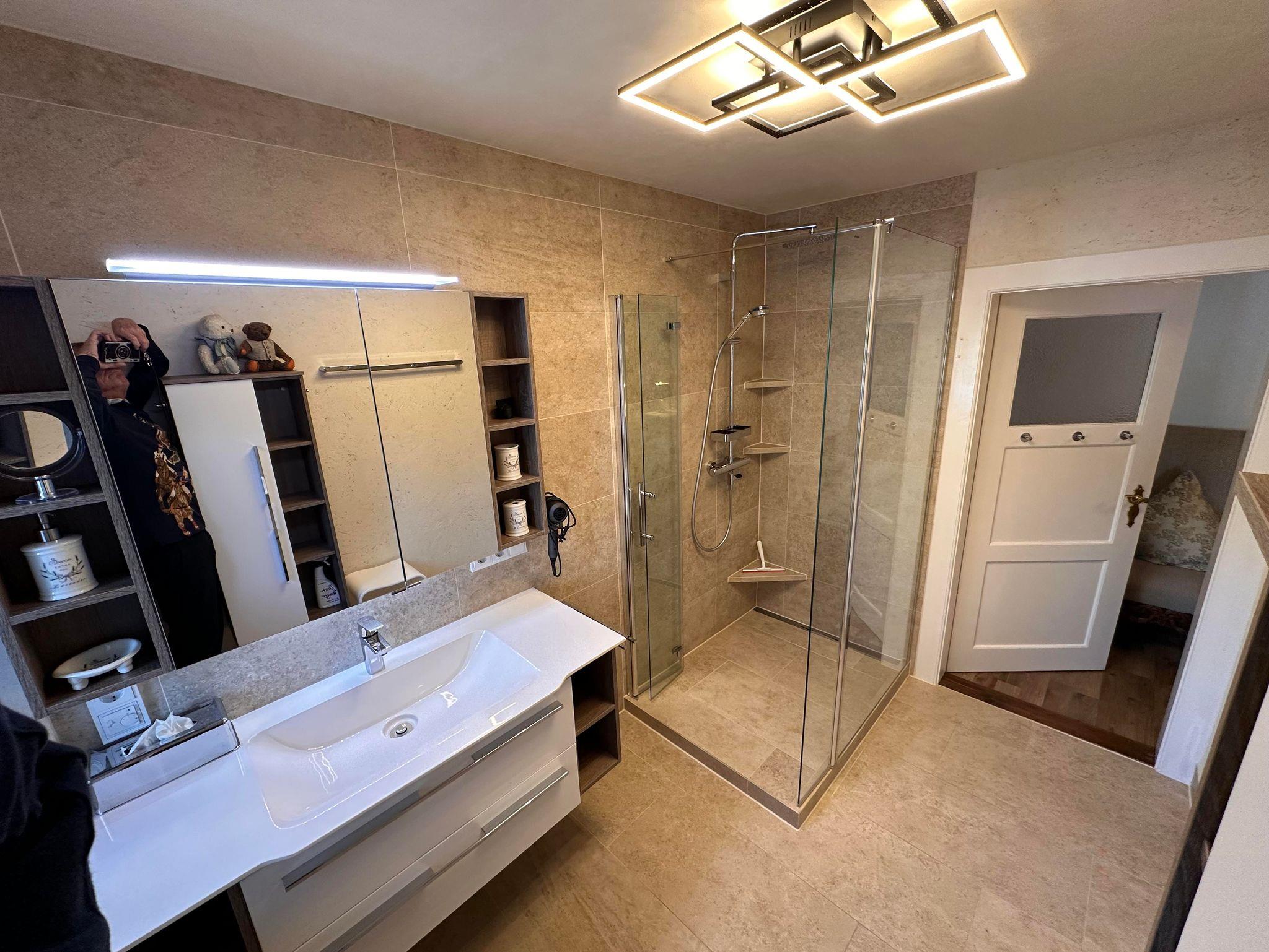 Das neue, geräumige Badezimmer mit Fußbodenheizung und Lehm-Putz für optimales Raumklima sowie ebenerdiger Dusche, Handtuchheizkörper und einem Fenster runden das Gesamtbild ab. Es befindet sich eine separate Toilette mit Fenster in der Wohnung.