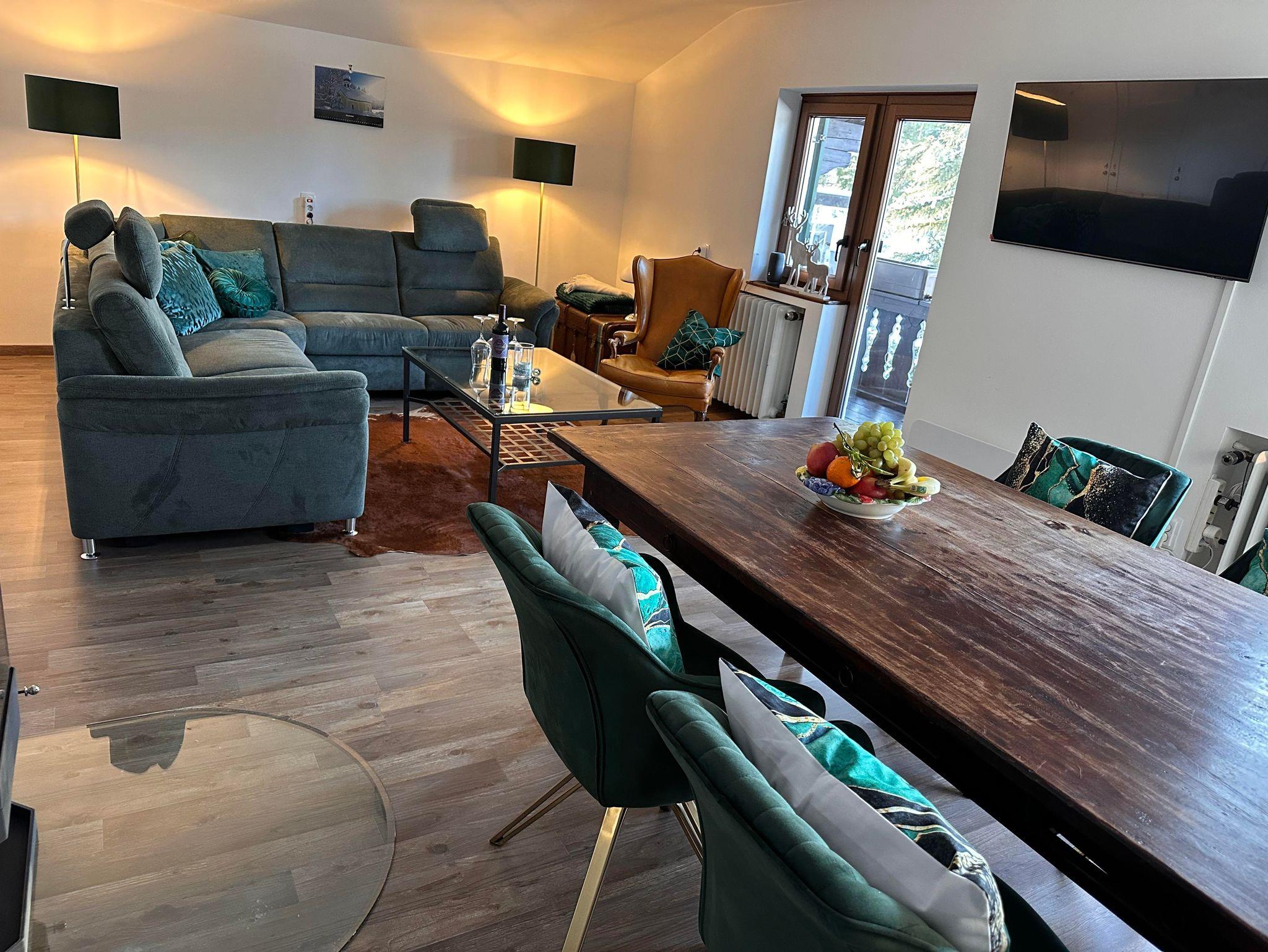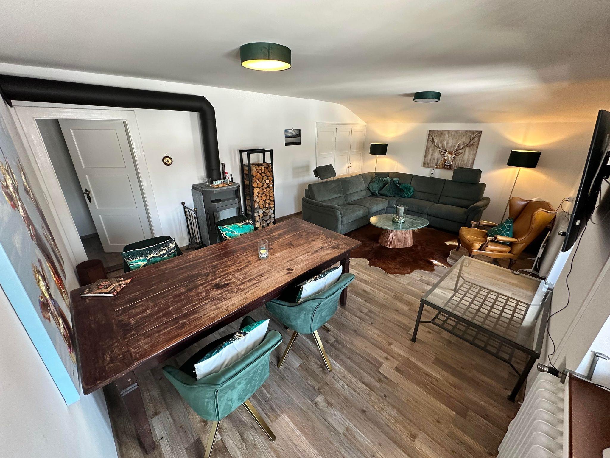 Das gemütliche Wohnzimmer mit Essecke und Sitzgarnitur sowie einem SAT-TV lädt zum Verweilen ein. Besonders zu erwähnen ist der Sicht-Kaminofen im Wohnzimmer, den Sie selbst befeuern.