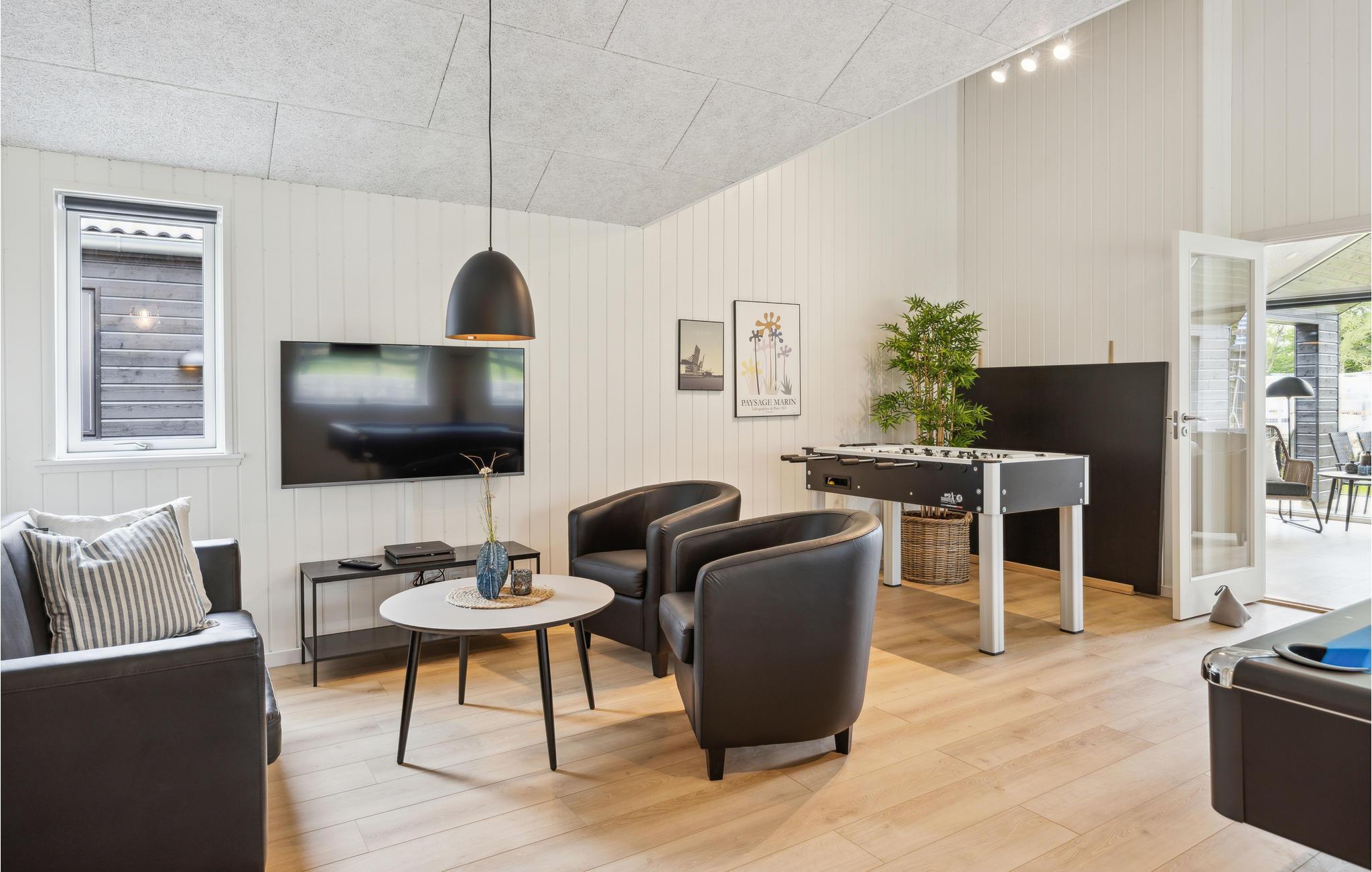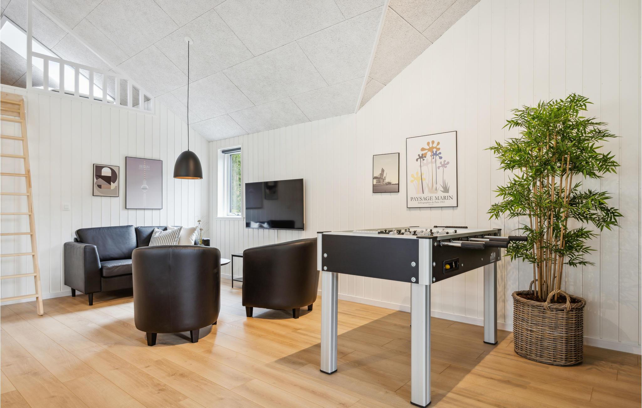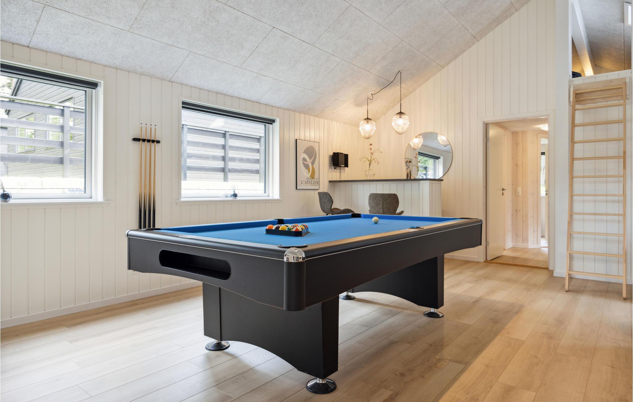 Dieses moderne Ferienhaus befindet sich in einem kleinen Ferienhausdorf in der Nähe von Krakow am See und unweit des Krakower Sees. Es bietet ein hochwertiges, helles Interieur und viele komfortable und familienfreundliche Einrichtungen. Das Herzstück des Hauses ist der schöne Wohnbereich mit offener Küche und Platz für gemeinsame Stunden beim Kochen. Die leckeren Mahlzeiten können Sie dann gemeinsam in geselliger Runde am großen Esstisch genießen. Fordern Sie sich im Aktivitätsraum gegenseitig zu einer Runde Tischtennis, Kicker oder Darts heraus und genießen Sie zwischendurch eine kalte Erfrischung an der Bar. Der schöne Pool mit Wasserrutsche lädt Groß und Klein zu vergnüglichen Stunden ein. Oder genießen Sie eine Massage im großen Whirlpool für 6 Personen und entspannen Sie sich danach in der eigenen Sauna. Das Haus verfügt über sechs Schlafzimmer und einen Dachboden mit vier Matratzen, der besonders gut für Kinder geeignet ist, die es sich dort gemütlich machen möchten. Die drei Badezimmer ergänzen das Angebot und machen das Haus für mehrere Familien oder Freunde sehr geeignet.