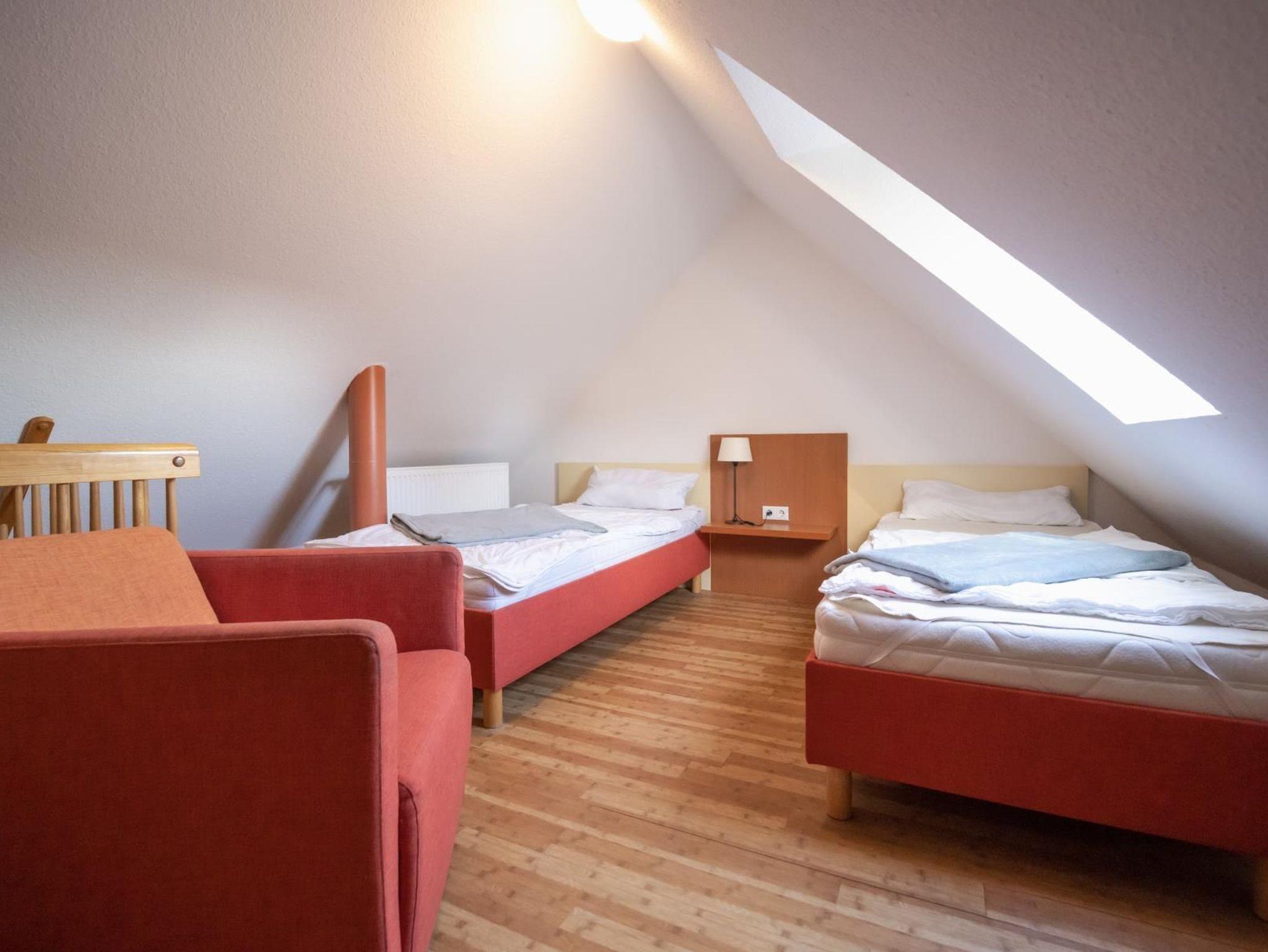 Schlafraum mit zwei Einzelbetten (auch als Doppelbett möglich) und Kommode.