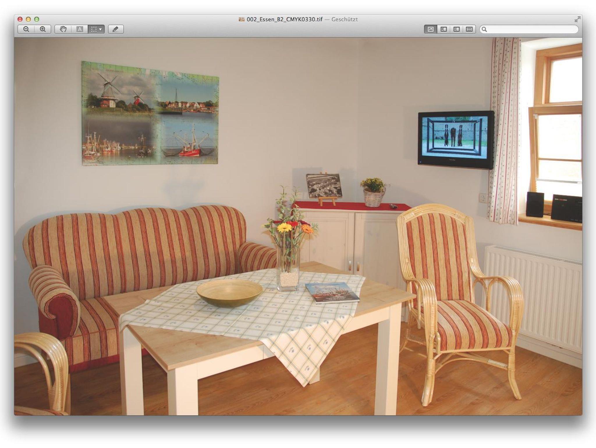 Wohnung 1 hat eine Wohnfläche von 60 m² und besteht aus einer Wohnküche mit einer Einbauküche, einem Schlafzimmer mit TV, einem Badezimmer und einem Wohnzimmer mit einer zusätzlichen Schlafgelegenheit. Aus dem Wohnzimmer heraus haben Sie einen wunderschönen Blick auf den Yachthafen mit den vielen Segelbooten und auf den malerischen Fischereihafen mit der größten Krabbenkutterflotte an der norddeutschen Küste.