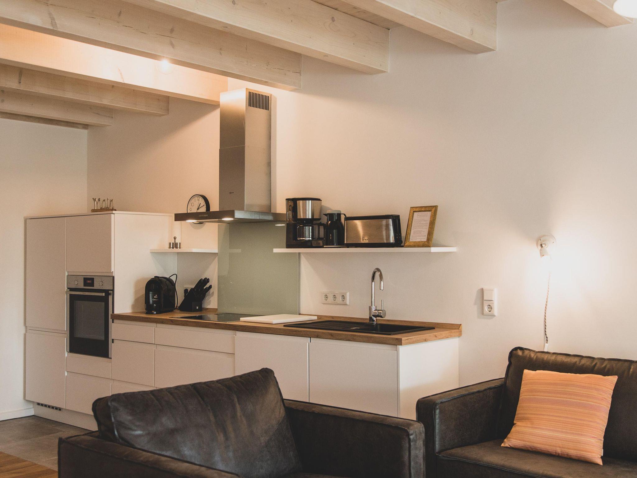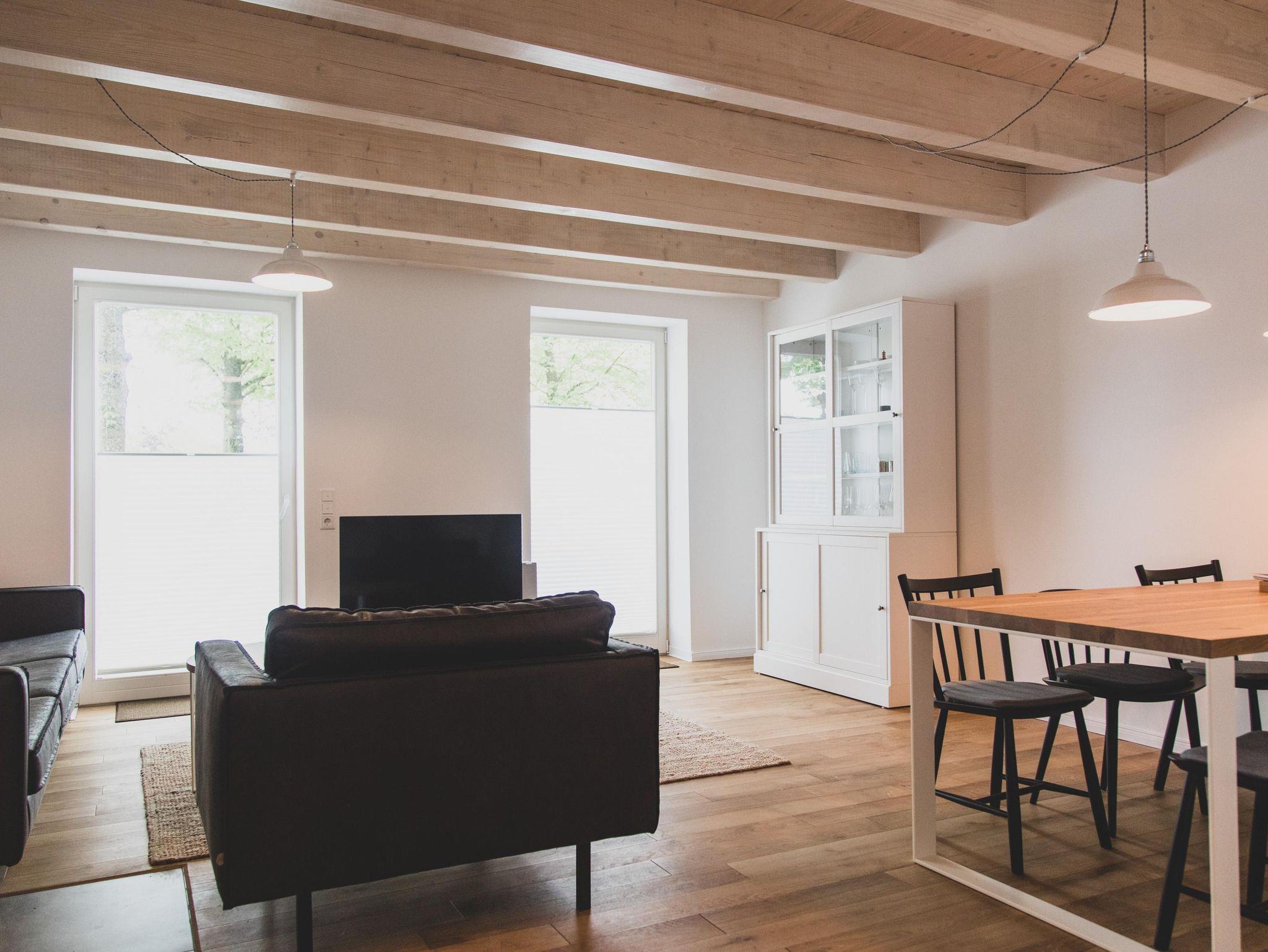 Der großzügige Wohn-, Ess- und Küchenbereich ist offen gestaltet und lädt zum geselligen Verweilen ein. Die von der Scheune her zugängliche Wohnung bietet mit 87 qm Wohnfläche bequem Platz und Ausstattung für bis zu 6 Personen. Die Terrasse ist bequem von Wohnbereich zugänglich. Terrassenmöbel, Sonnenschirm und Grill stehen zur Benutzung bereit.