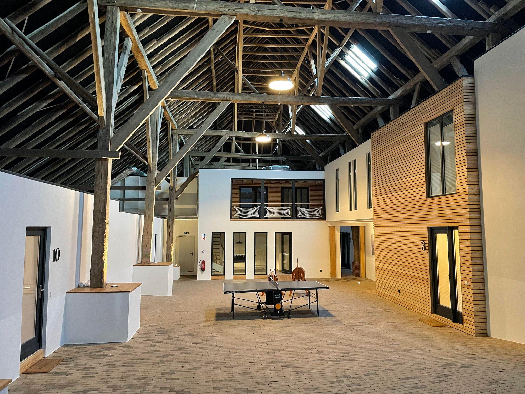Unsere Wohnungen im Vorderhaus des Ferienhofs verfügen über hohe Decken mit durchgehend erhaltenen alten Deckenbalken. Die historischen Blockrahmenfenster und Fensterläden wurden in Handarbeit neu erstellt und runden den Anblick des denkmalgeschützten Gulfhofs ab. Im ehemaligen Scheunentrakt befinden sich durch bodentiefe Fenster helle und großzügig geschnittene Wohnungen. Alle Ferienwohnungen sind individuell, modern und mit viel Liebe zum Detail eingerichtet und bieten von der Terrasse einen erholsamen Blick auf die Grünflächen mit altem Baumbestand.