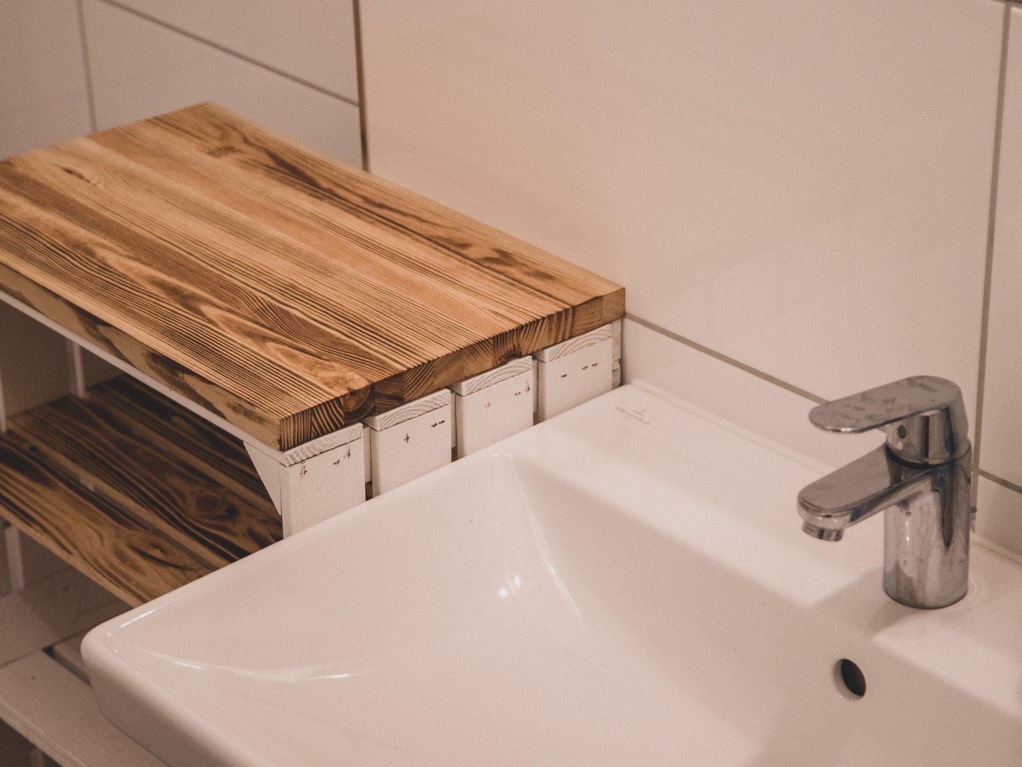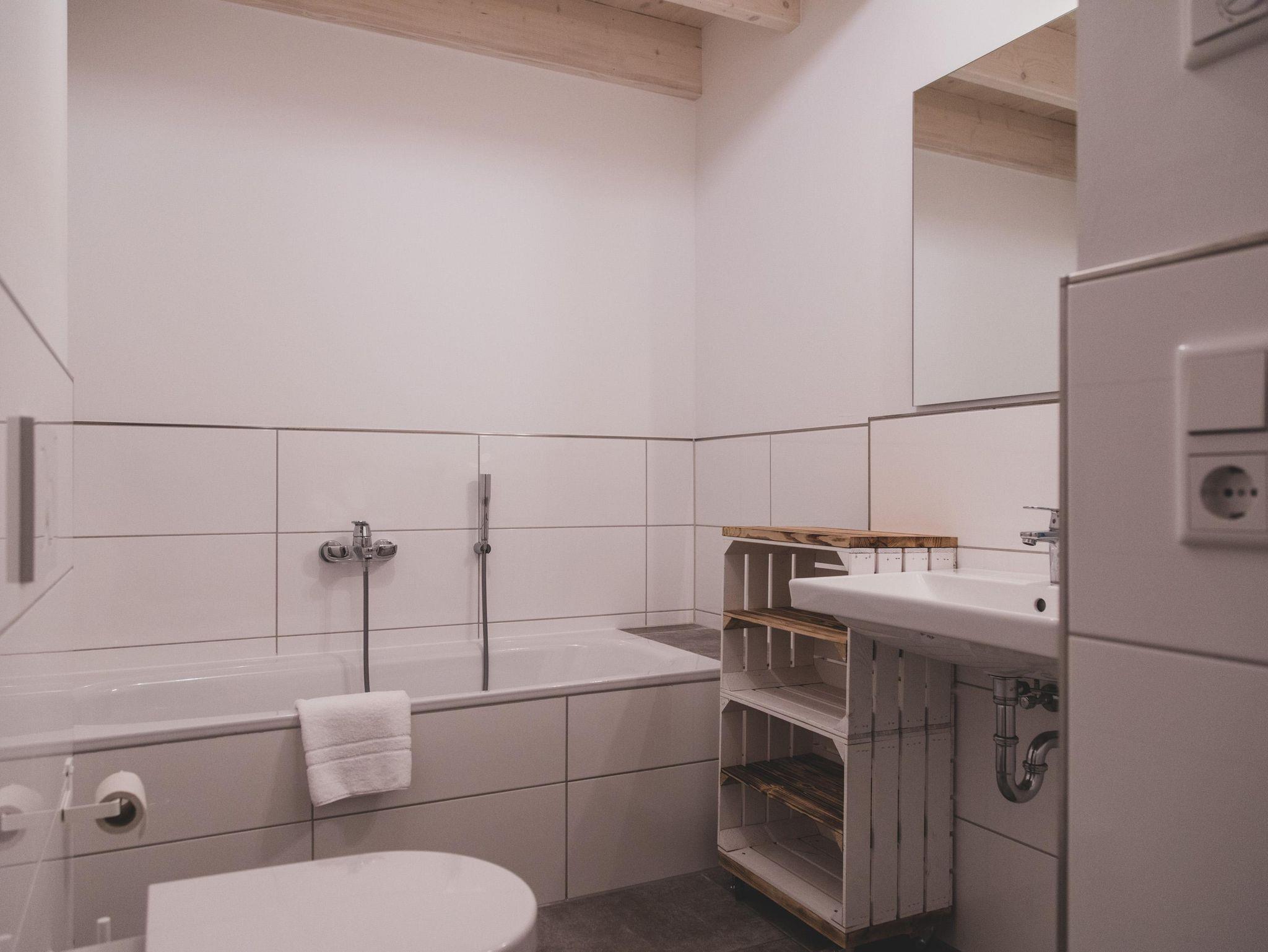Im Eingangsbereich befindet sich ein Bad mit Dusche.
