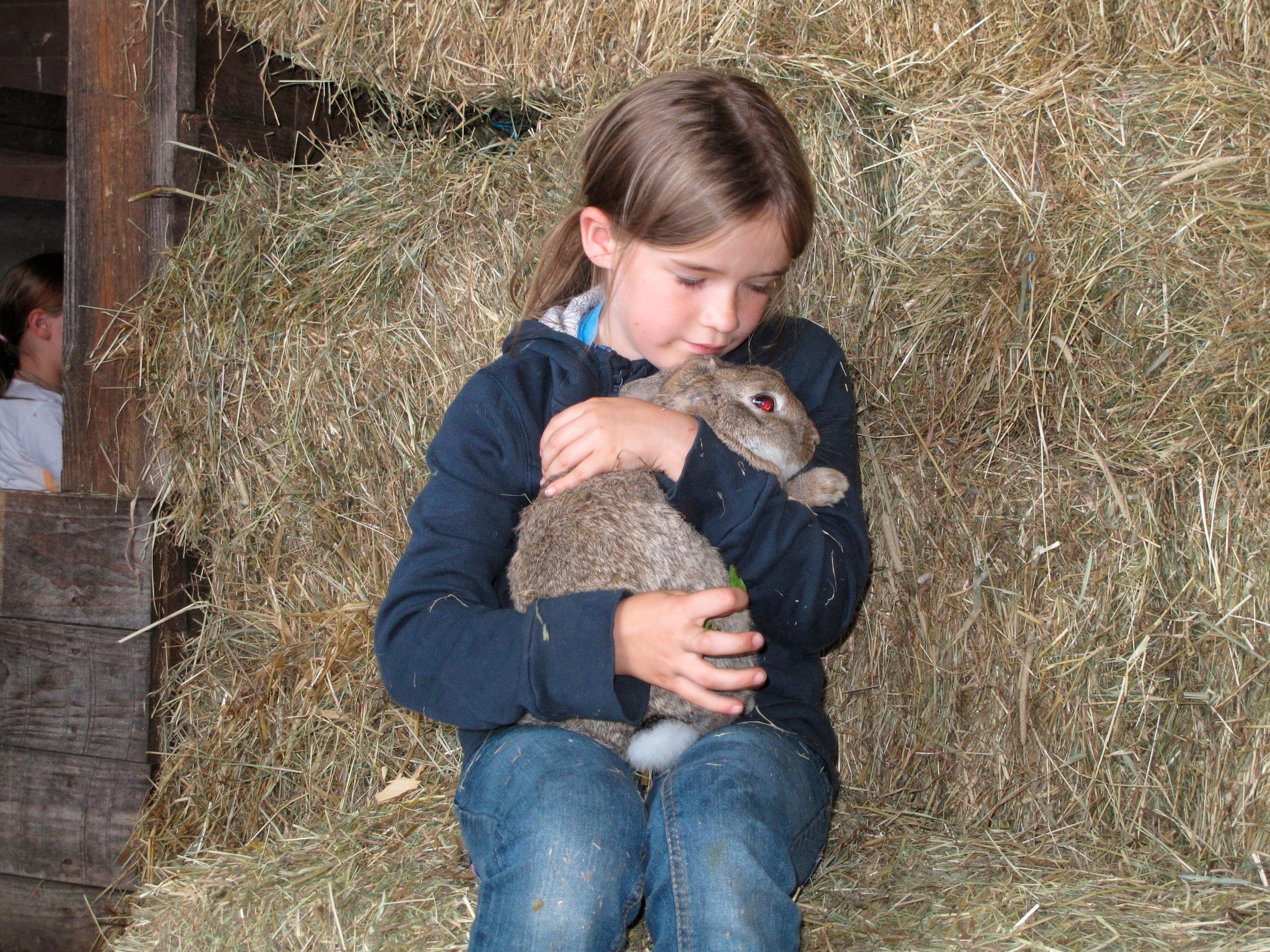 Ziegen, Schafe, Kaninchen, Hühner, Enten, Katzen, Rinder und 3 Ponys.