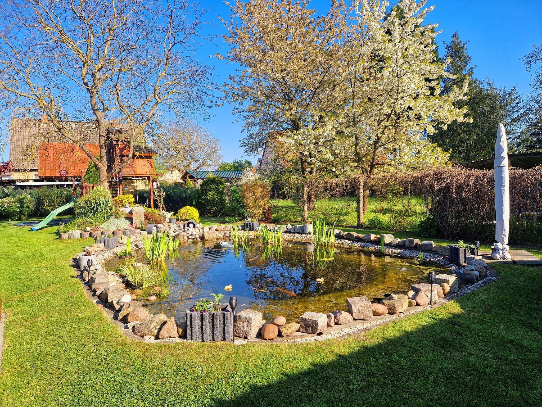 Der Garten kann genutzt werden und hat eine Liegewiese mit Grillmöglichkeit und großer Terrasse zum entspannen.