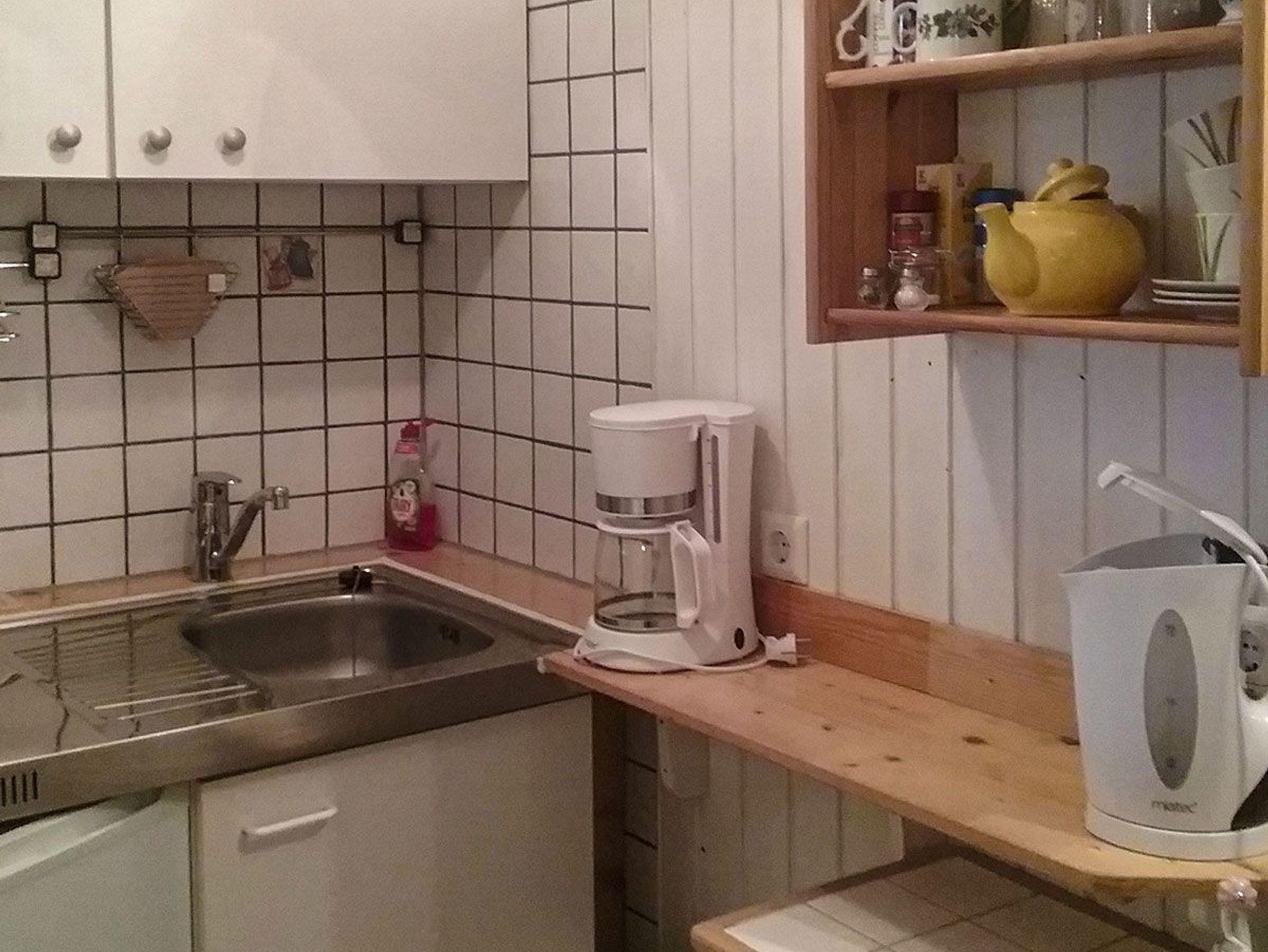 Küche voll ausgestattet mit E-Herd, Kühlschrank, Kaffeemaschiene, Wasserkocher, Toaster, Mikrowelle, Grill und Geschirr