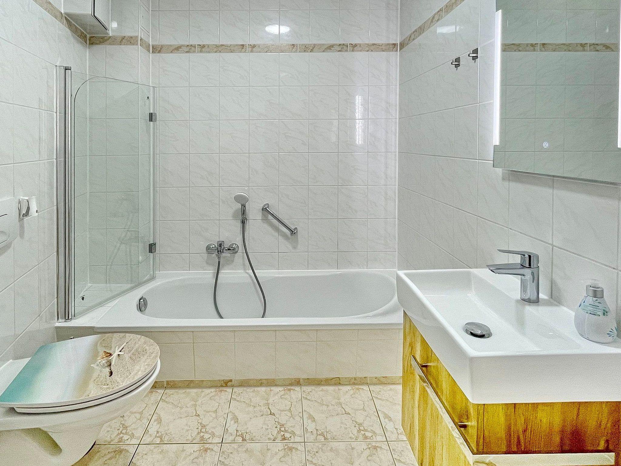 Diese freundlich eingerichtete Ferienwohnung im modernen Landhausstil bietet Ihnen ein großes Wohnzimmer mit Esstisch, Flachbild-TV, sowie eine gemütliche Schlafcouch. Die Küchenzeile ist in der Wohnzimmernische integriert. Sie ist voll ausgestattet, mit einem Backofen, einem Standkühlschrank und Gefriermöglichkeit. Vom Flur aus gehen Sie links ins geräumige Schlafzimmer mit einem Doppelbett. Das Zimmer befindet sich auf der Hinterseite der Wohnung und liegt somit zur Gartenseite, sehr ruhig. Das Bad ist mit einer Badewanne ausgestattet. Dies können Sie auch als Dusche mit einer Glasklappwand umfunktionieren. WC und Waschbecken mit Unterschrank, Handtuchhalter und Regal stehen Ihnen ebenfalls im Bad zur Verfügung.