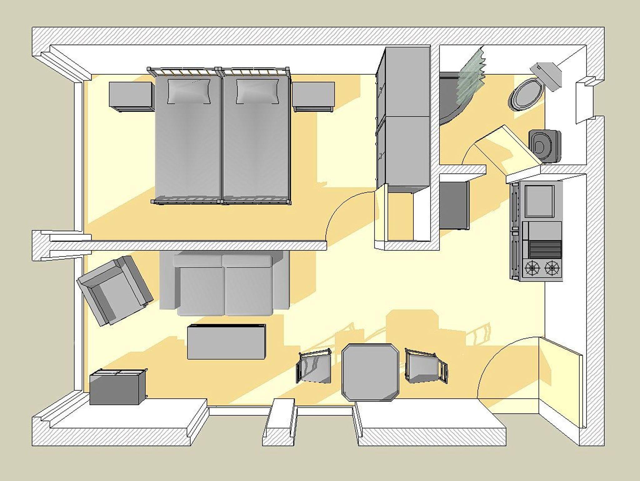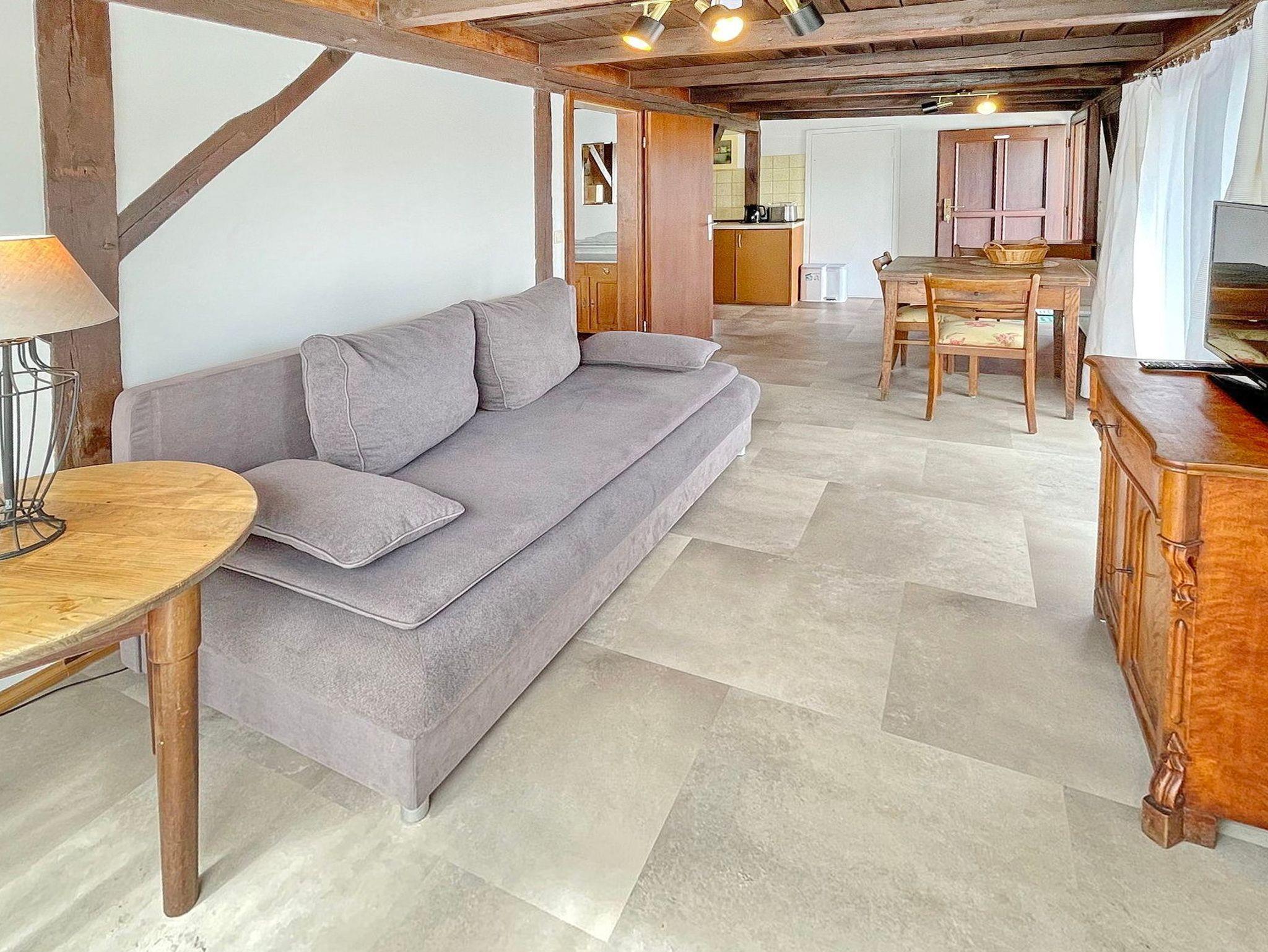 Die Ferienwohnung Rüster befindet sich in der 1. Etage. Sie ist unterteilt in Wohnzimmer mit Küchenzeile und einem separaten Schlafzimmer mit einem Doppelbett. Das Bad ist mit einer Dusche und WC ausgestattet.