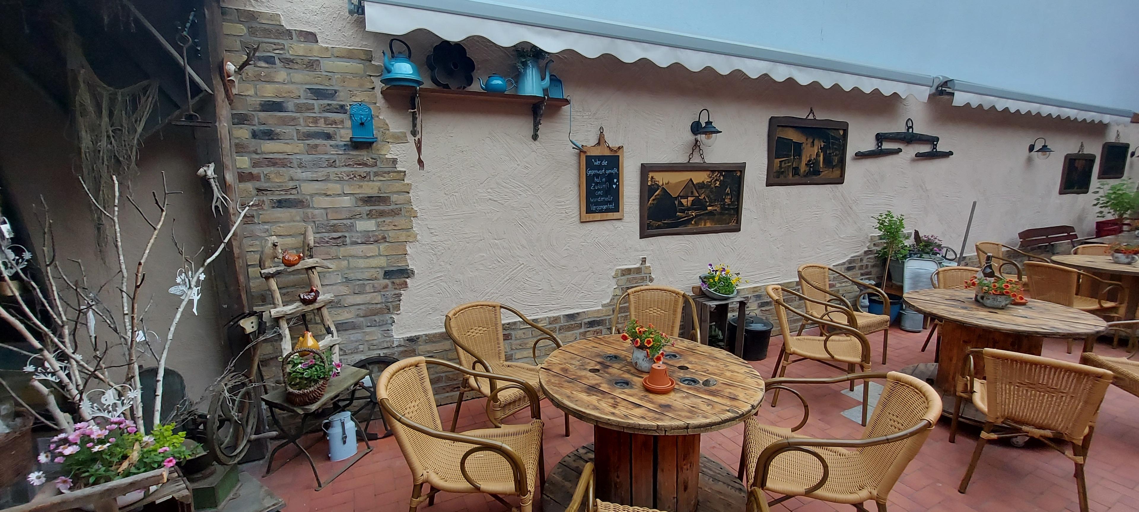 Im Hof der FEWO können sie bei einem Stück hausgebackenem Kuchen und leckeren Kaffeespezialitäten die Seele baumeln lassen.