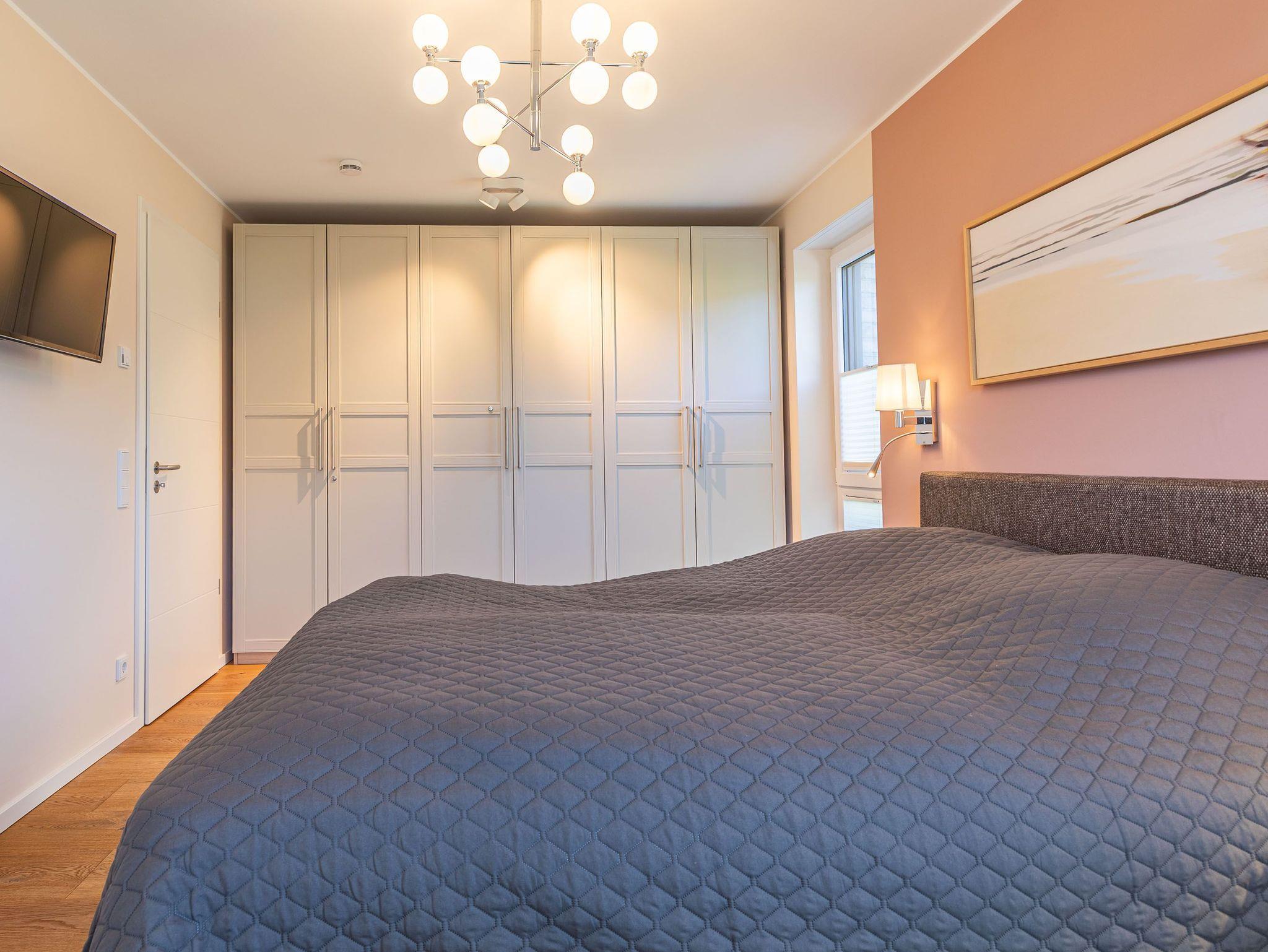 Hier erwartet Sie eine neu errichtete Wohnung mit gehobenem Wohlfühlcharakter in einem exklusiven Appartementanlagenneubau. Mit ihrem hochwertigen Ambiente lässt sie keine Wünsche offen. Der Wohnraum ist mit einer gemütlichen Couch mit Récamiere, einem Sessel und einem Couchtisch ausgestattet. Die Einrichtung wird mit einem Sideboard ergänzt. Die hochmoderne Küche ist im offenen Wohn- und Essbereich integriert, von dem Sie auch einen der großzügigen Balkone erreichen. Das erste Schlafzimmer ist mit einem Boxspringbett (180 cm x 200 cm) und einem Kleiderschrank ausgestattet. Das weitere Schlafzimmer verfügt über ein Boxspringbett (180 cm x 200 cm) und ebenfalls einen Kleiderschrank. Eines der beiden Duschbäder geht vom Flur ab. Das zweite Duschbad erreichen Sie direkt vom Schlafzimmer, wie auch den zweiten Balkon.