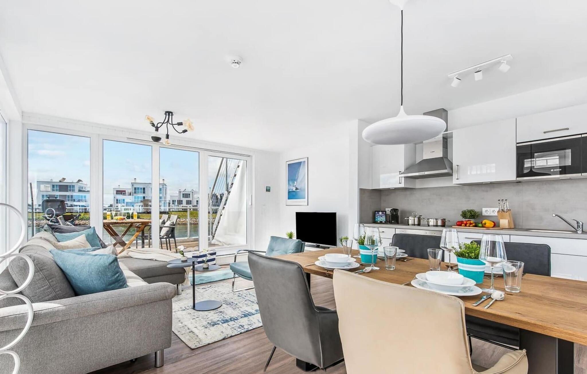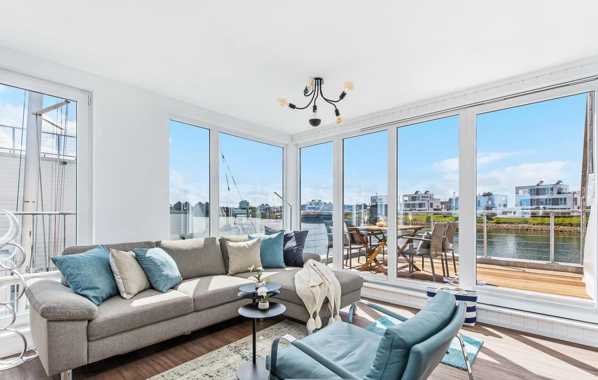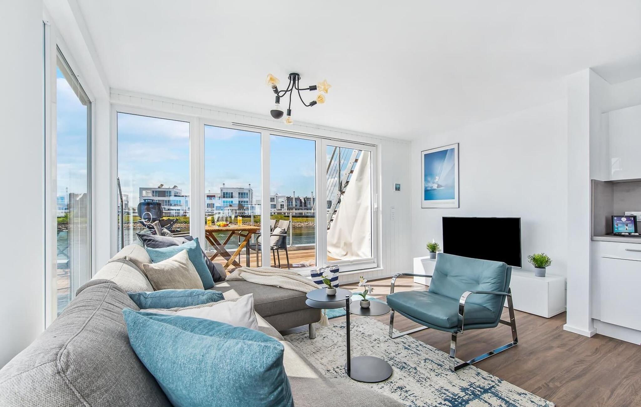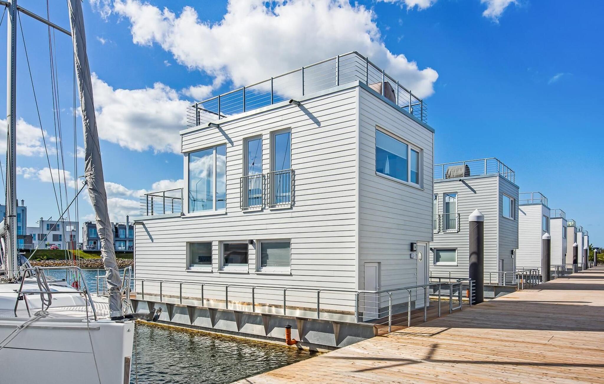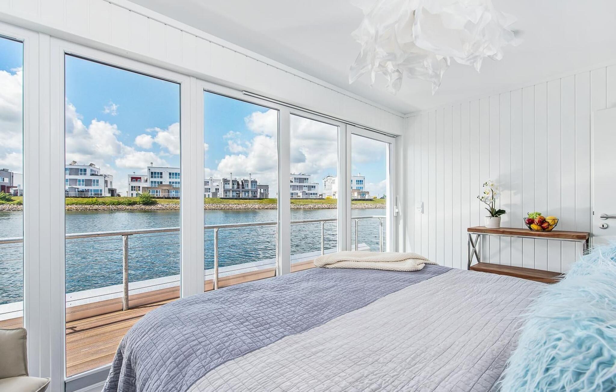 Entdecken Sie das schwimmende Ferienhaus La Marina mit Panoramablick, Sauna und direktem Wasserzugang am OstseeResort Olpenitz.