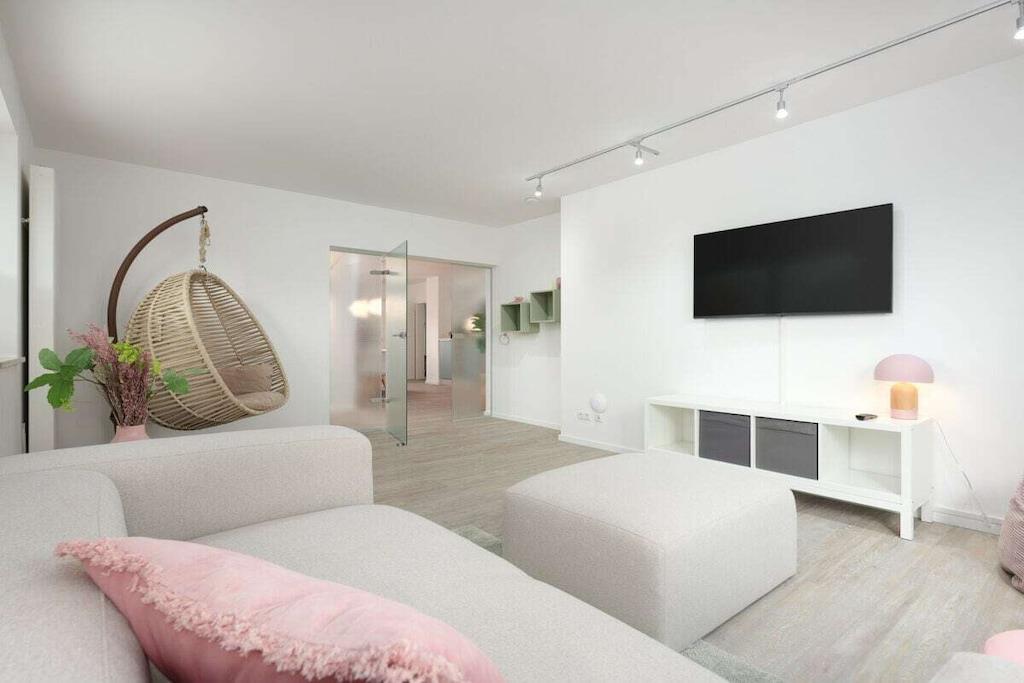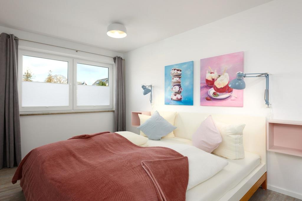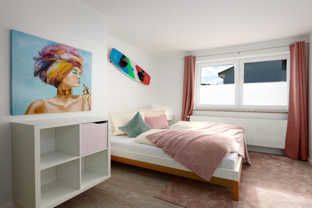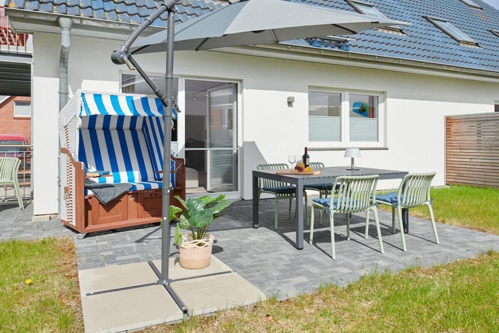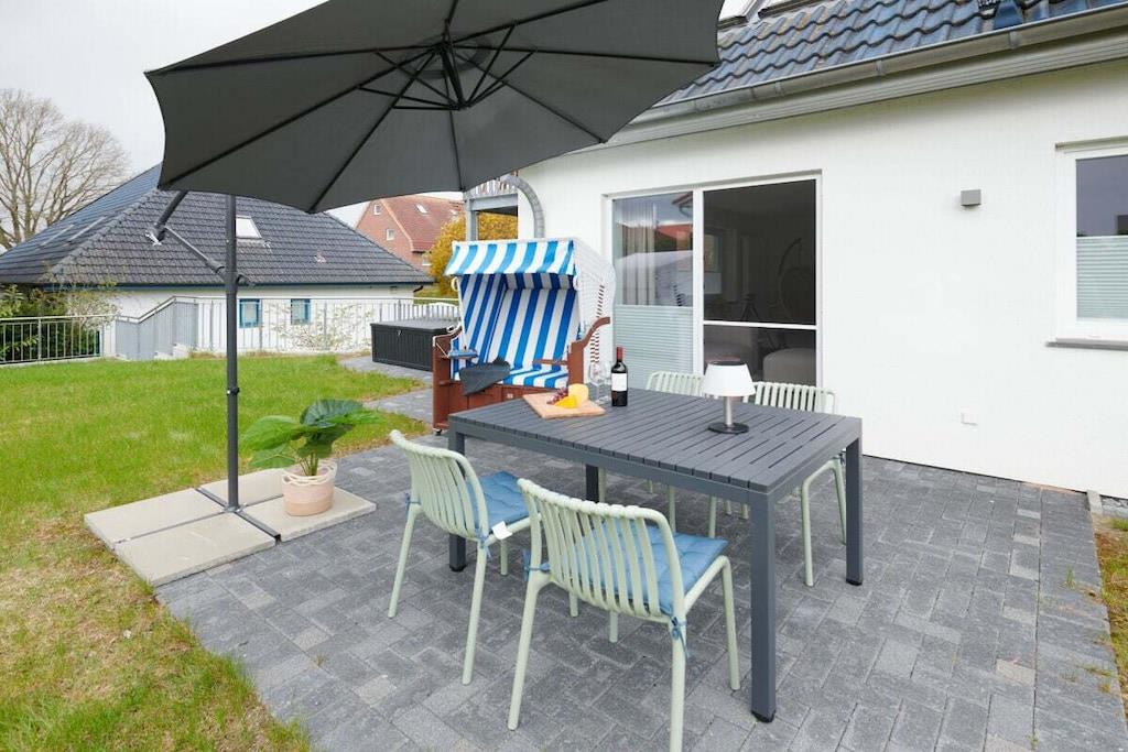 Erleben Sie moderne Kunst und Komfort in der barrierearmen Surflounge in Laboe mit Terrasse und Strandkorb.