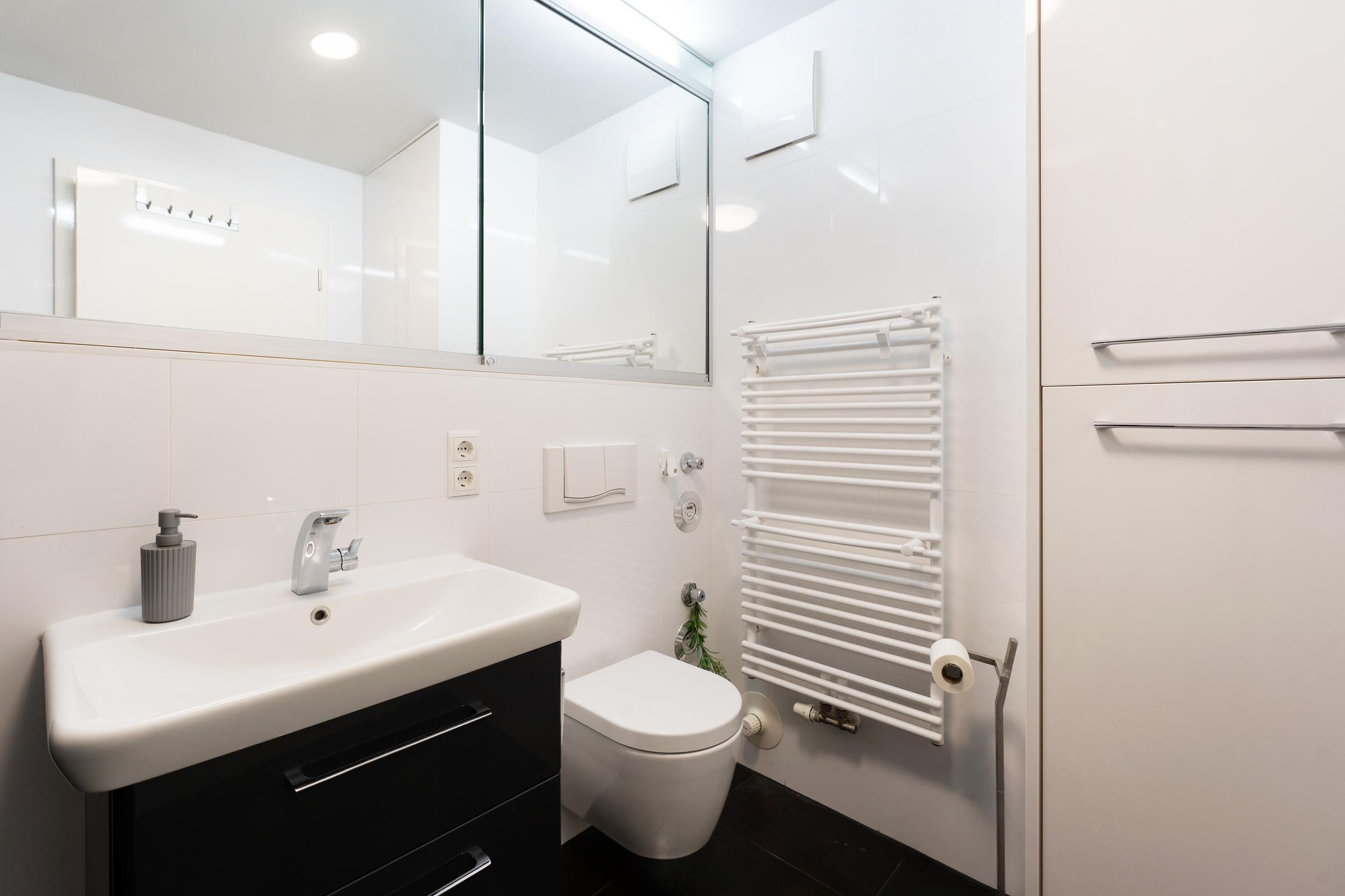 Im vollständig ausgestatteten Bad erwarten Sie eine bodengleiche Dusche mit Haltegriff. Ein zusätzliches Gäste-WC ist ebenfalls vorhanden.