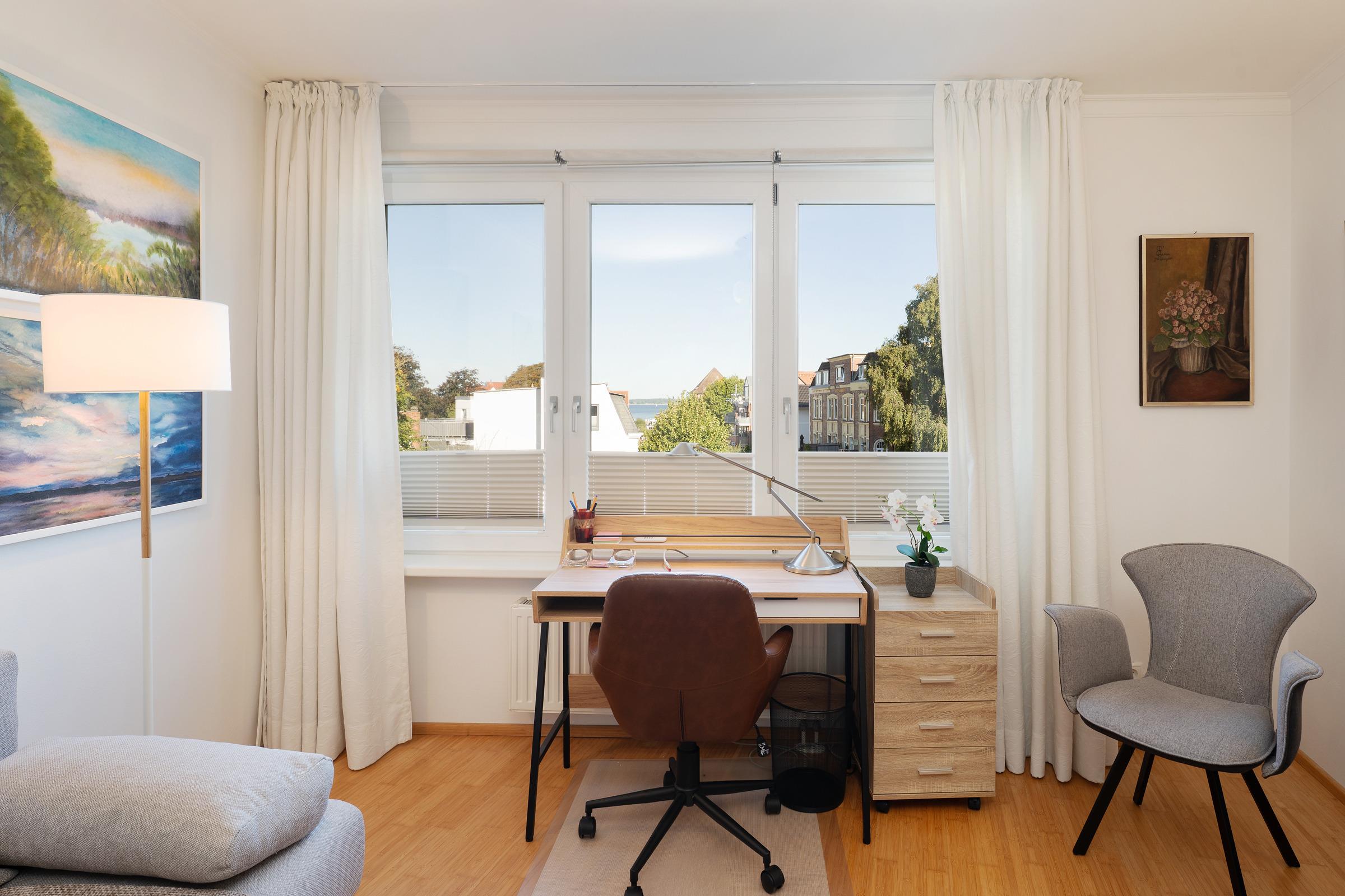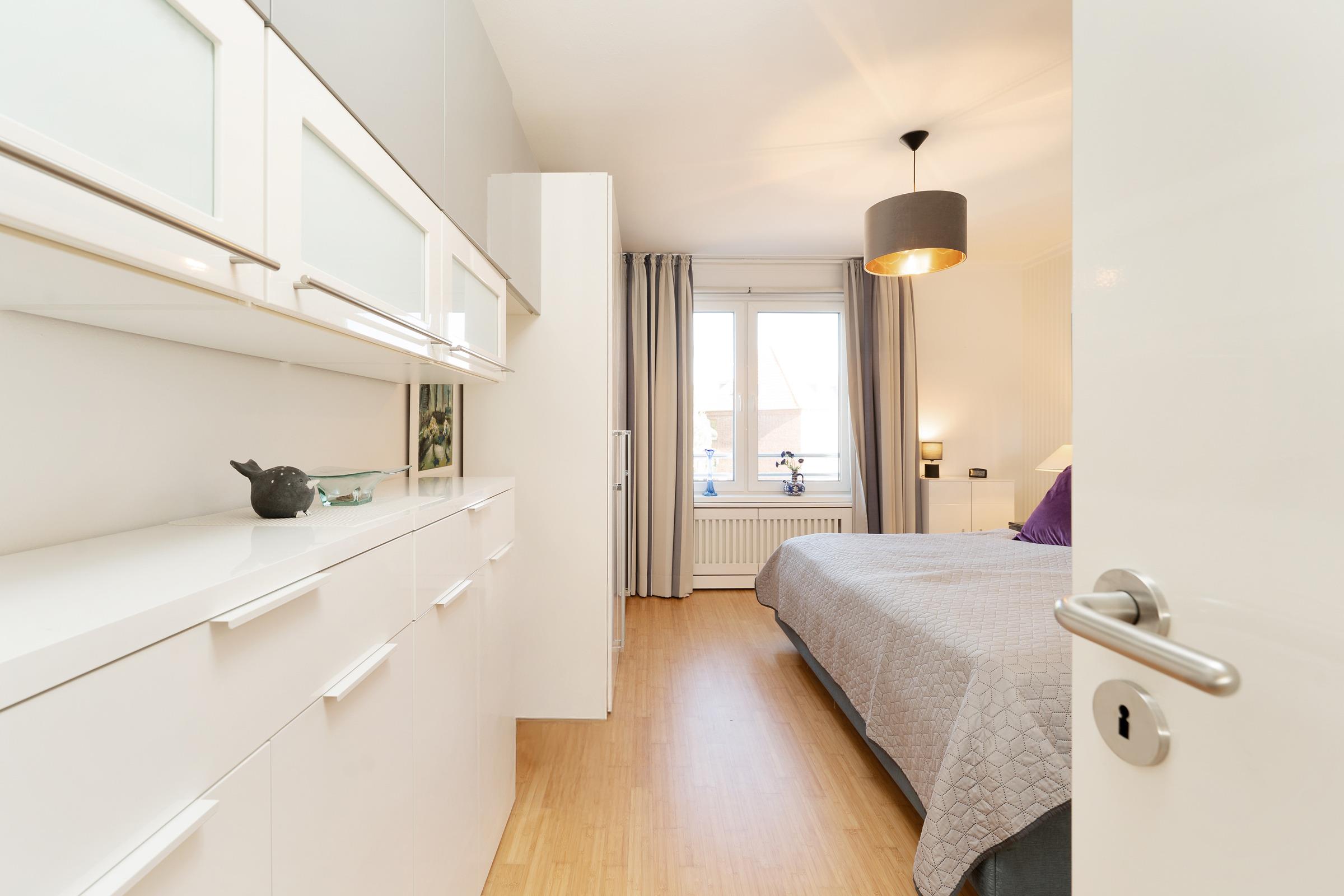 Der helle Wohnbereich lädt mit Fernseher, Musikanlage und gemütlichem Sofa zu entspannten Stunden ein. Von hier aus gelangen Sie direkt auf den Balkon - der mit Gartenmöbeln, einer großen automatischen Markise und Sonnenschirm ausgestattet ist - und zu sonnigen Stunden im Freien einlädt. Die Küche bietet alles, was Sie für die Zubereitung köstlicher Mahlzeiten benötigen: Backofen mit Grillfunktion, Kaffee- und Espressomaschine (Cafissimo), Kühlschrank sowie einen Gefrierschrank und natürlich auch einen Geschirrspüler. Am großen Esstisch genießen Sie Ihre Mahlzeiten. Das Schlafzimmer ist komfortabel eingerichtet – mit großem Doppelbett, geräumigem Kleiderschrank und halbhohen Wäscheschränken. Das dritte Zimmer ist mit einem variablen Schlafsofa ausgestattet, das ansonsten eine bequeme Couch ist. Es ist ein gemütliches Zimmer mit einem Computer-Schreibtisch, kleinem Kleiderschrank und Bücherregalen: ein sogenanntes "Rückzugszimmer" zum Lesen und Entspannen.