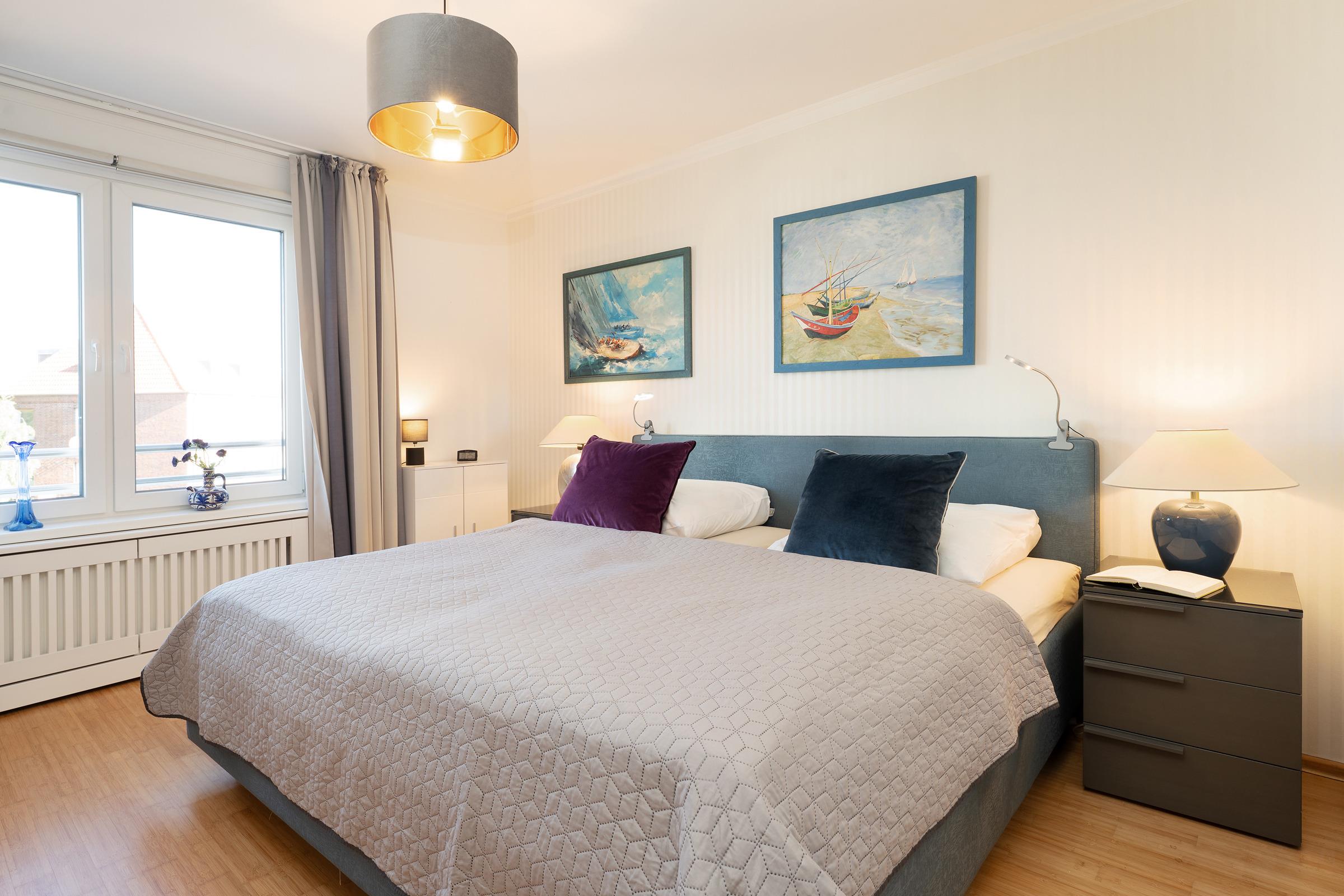 Schlafzimmer: 1 Doppelbett (2x 100 x 200 cm), TV, Verdunkelung: Plissee und Gardine, kein Platz für ein Babybett vorhanden