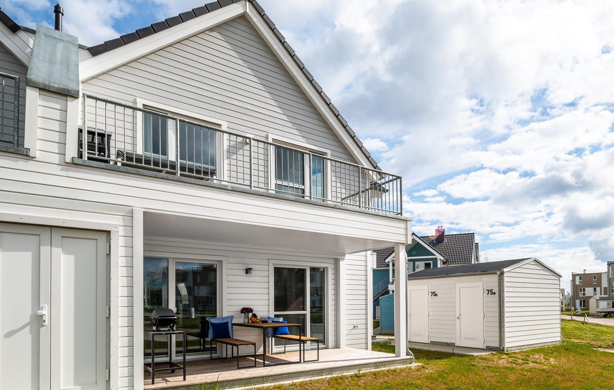 Eine großzügige, überdachte Südterrasse lädt dazu ein, den Tag mit der Familie im Freien zu verbringen und die wärmende Ostseesonne zu genießen. Diese Terrasse ist mit einer Essgarnitur und einem Elektrogrill ausgestattet, perfekt für Mahlzeiten im Freien und gemütliche Grillabende.