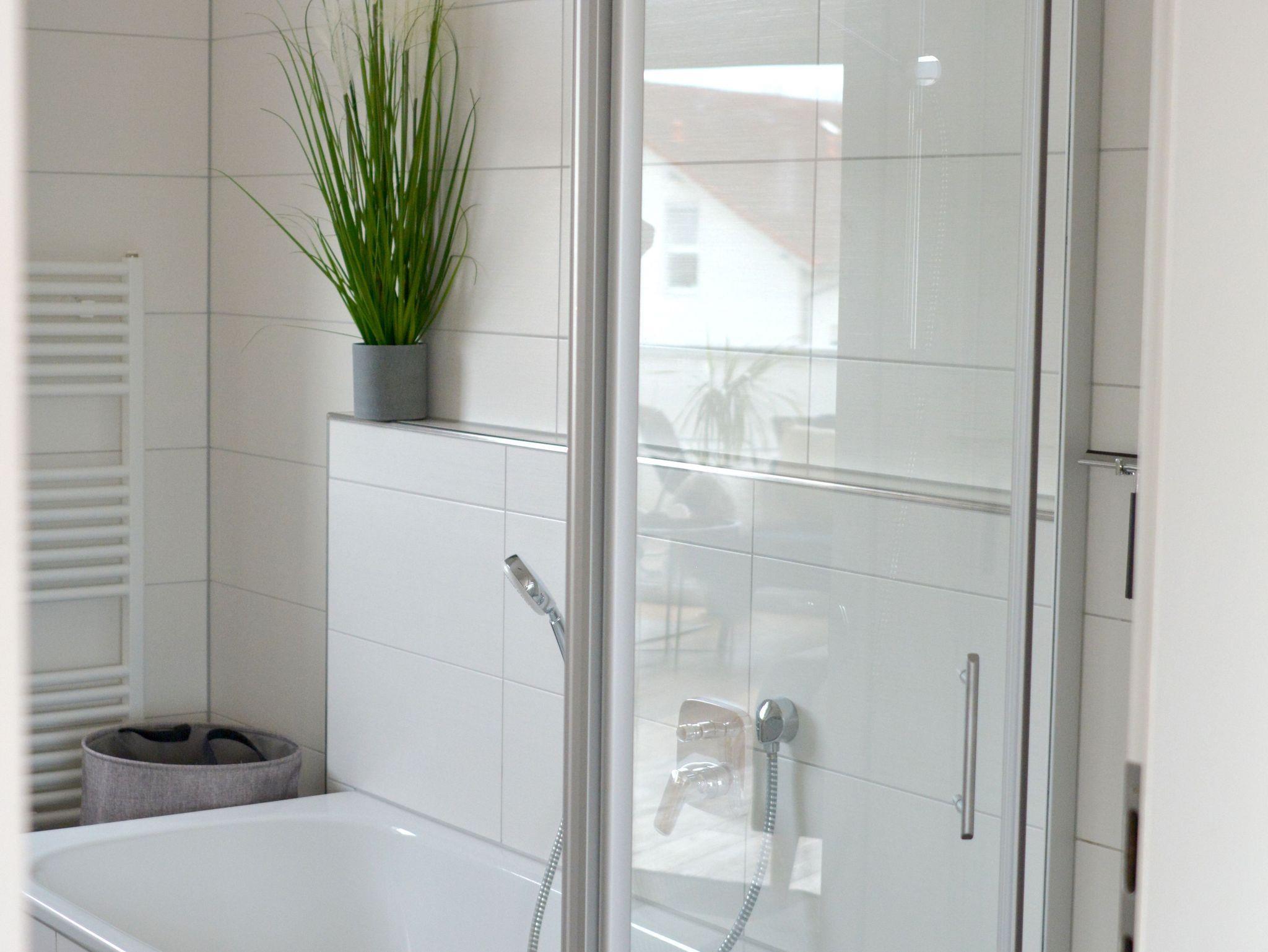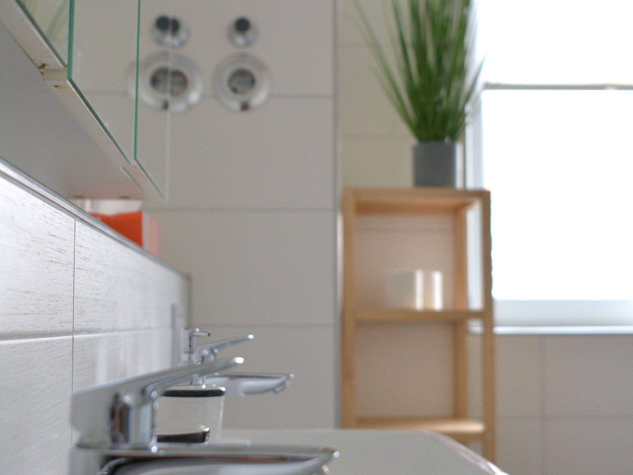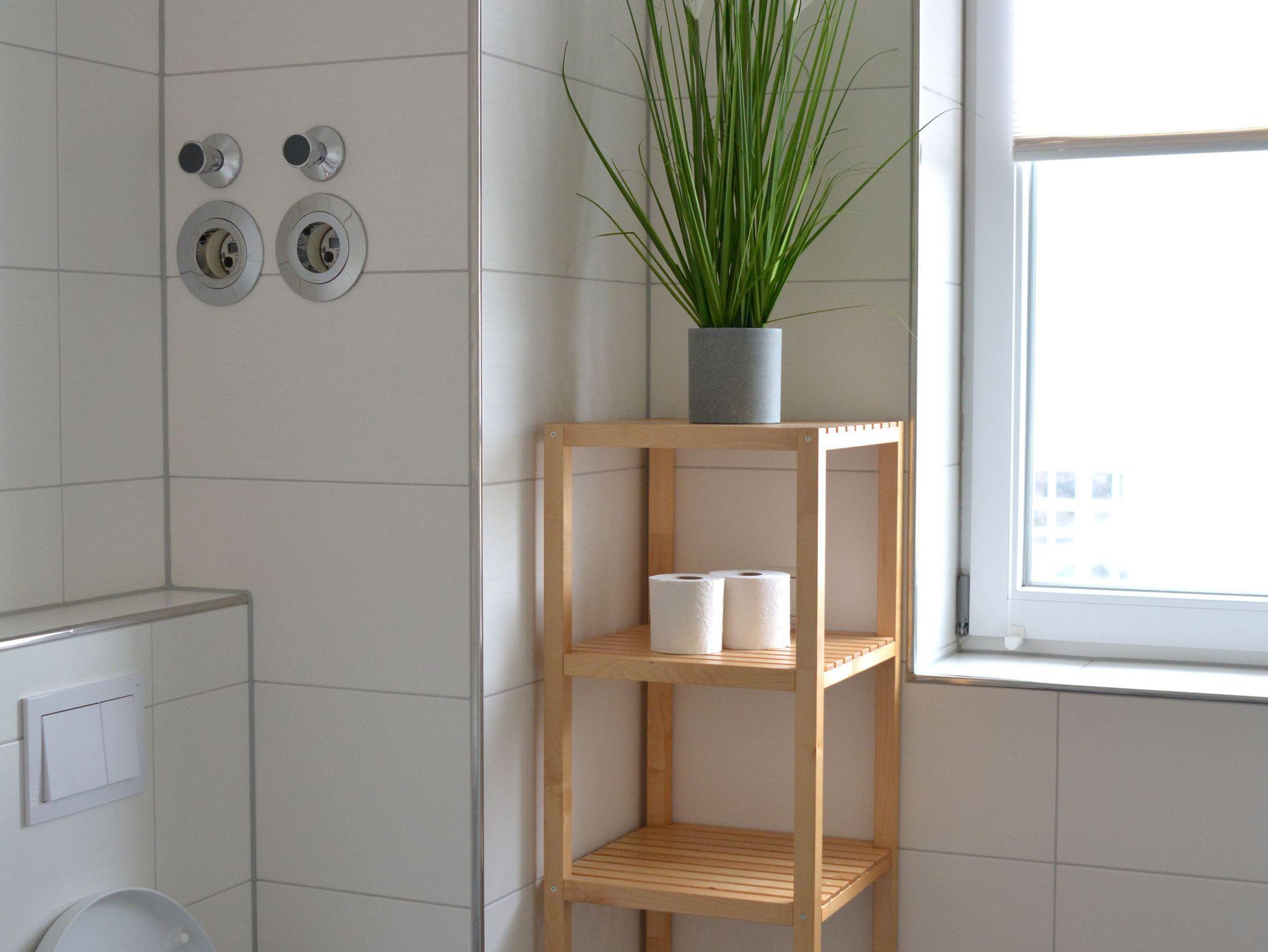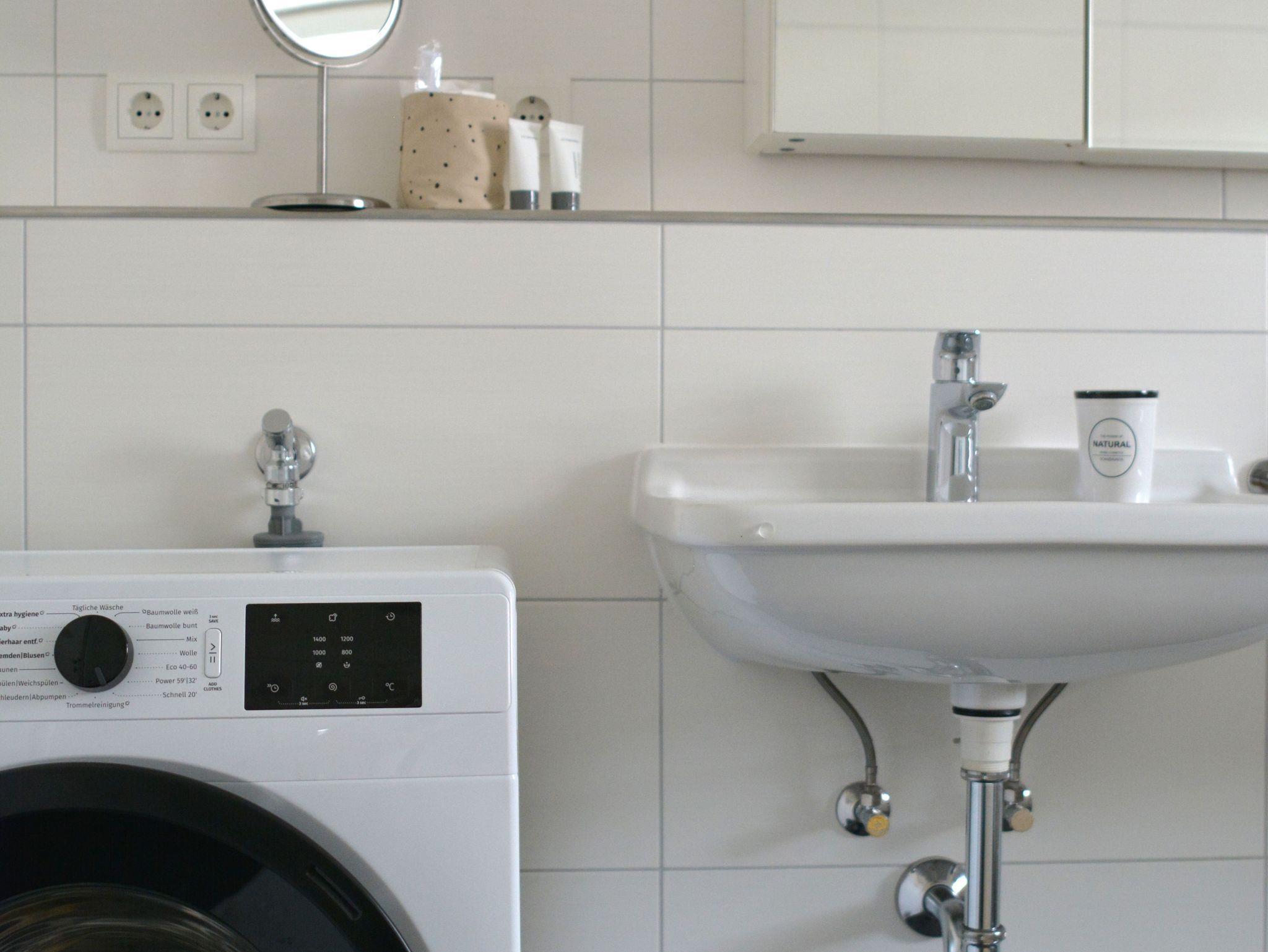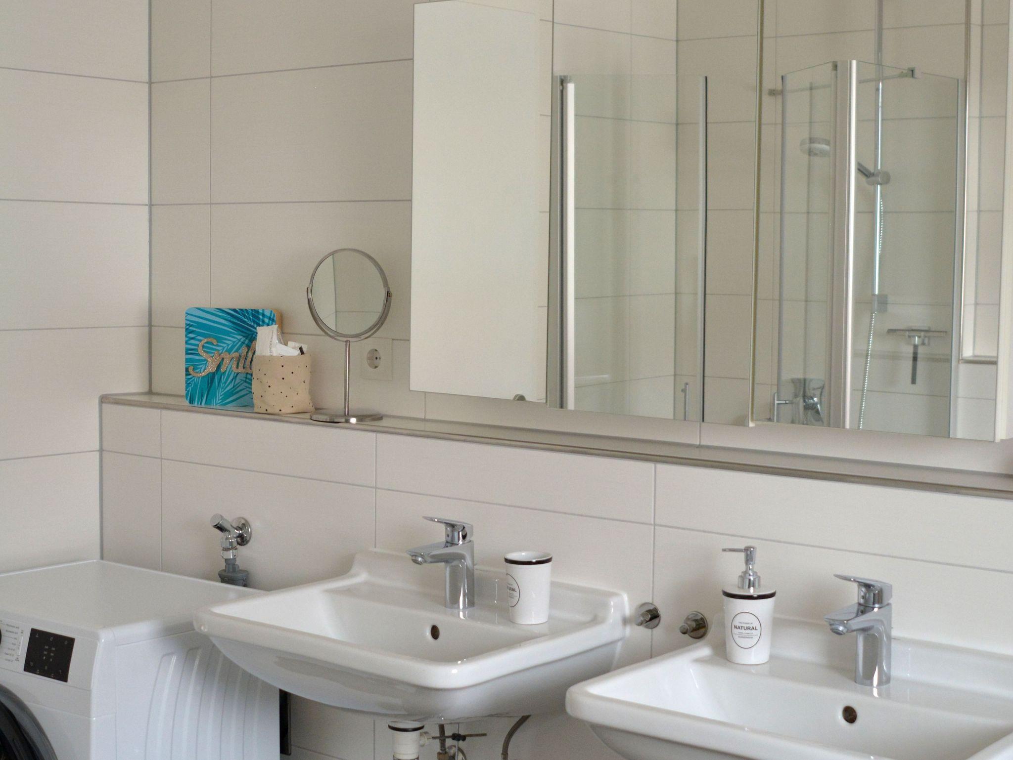 Bad: 2 getrennte Waschbecken, Badewanne und Dusche im Bad vorhanden, Handtuchwärmer, Fliesen im Bad, Spiegelschrank, Föhn, Fenster im Bad, Waschmaschine