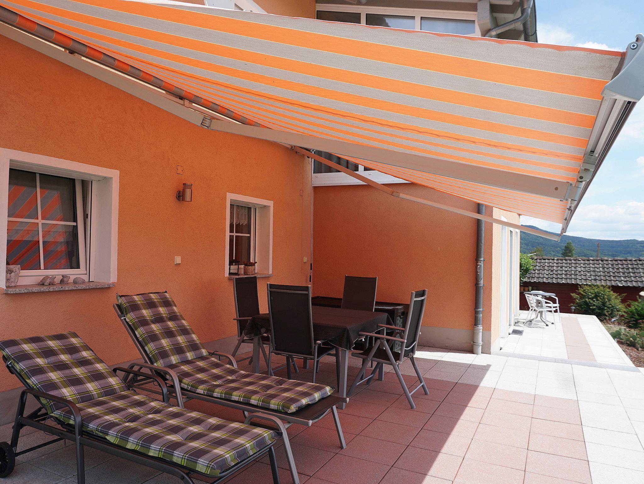 Die große Terrasse ca.50 m² ist mit Gartenmöbel ausgestattet und mit einer Markise beschattet, genießen Sie den herrlichen Panoramablick, mit etwas Glück an manchen Tagen bis zu den Alpen.