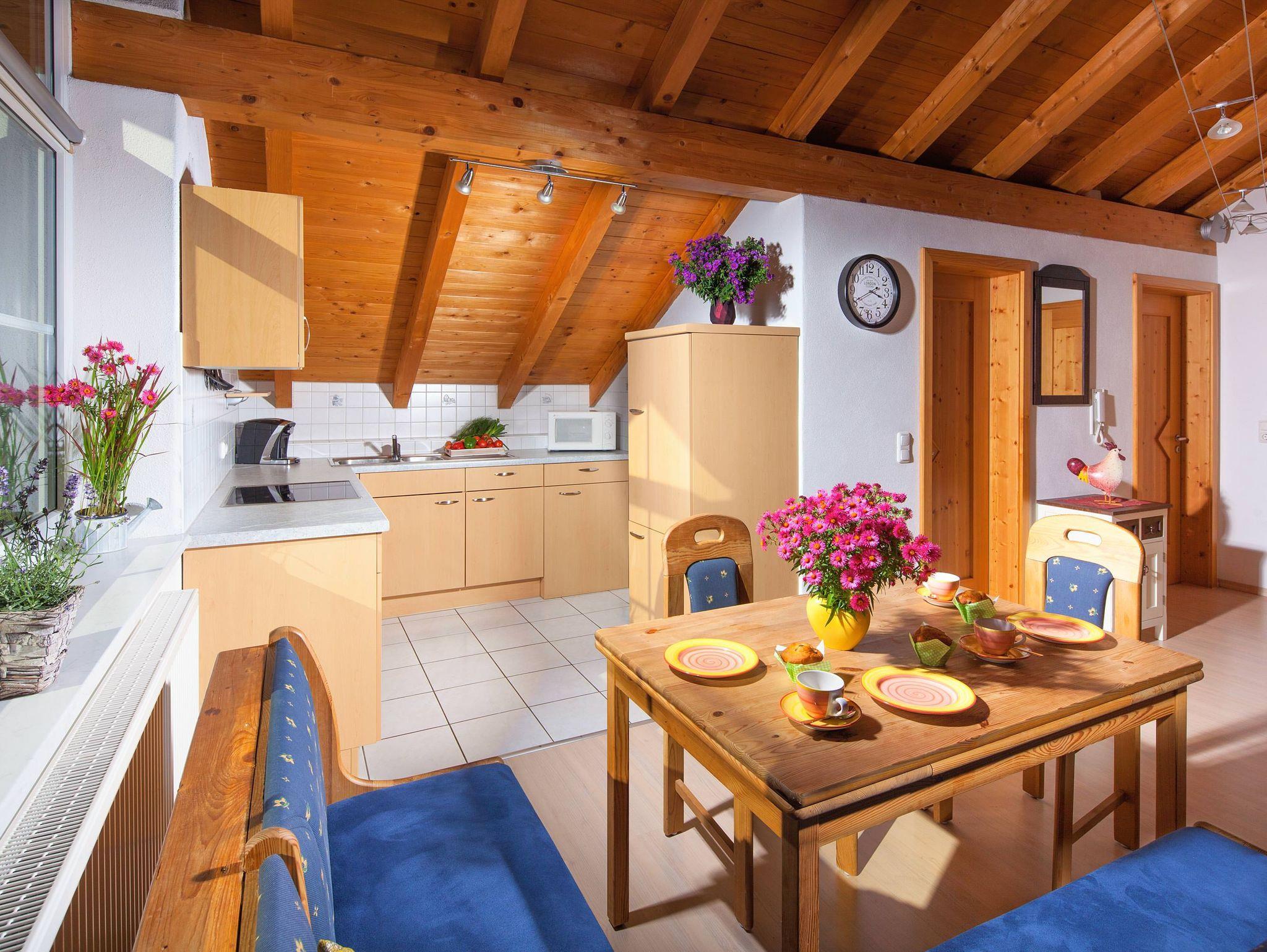 Sie wollten schon immer einmal im Dachgeschoss wohnen? Die Dachschräge und viel Holz sorgen für eine einzigartige Atmosphäre. Natürlich haben Sie auch dort einen sonnigen Südbalkon mit herrlichem Weitblick über die liebliche, bunte Landschaft zu den Bergen. Eine Einbauküche läd zum Kochen ein. Tisch, Eckbank und Bestuhlung wurden aus Naturholz angefertigt.