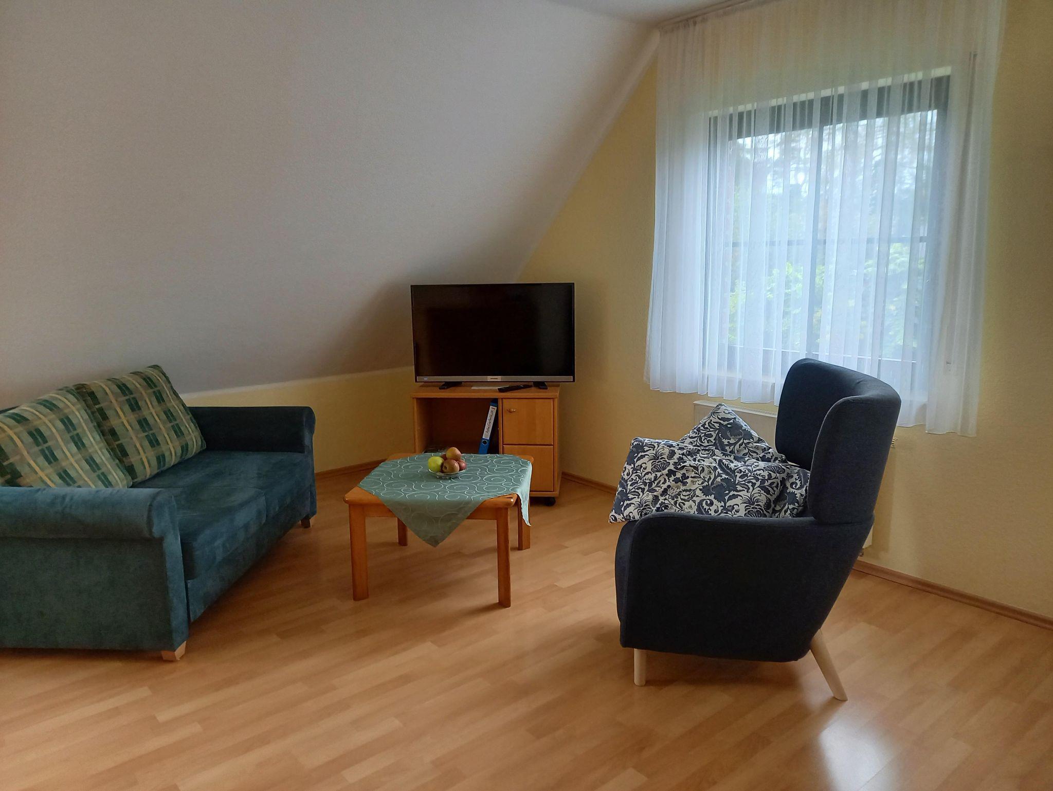 Mit unserem Appartement bieten wir Ihnen eine komfortable Ein-Raum-Wohnung für 1-2 Personen. Ihnen steht ein 1,40 m breites Bett zur Verfügung und ein geräumiger Kleiderschrank. Der sich anschließende Wohnbereich besteht aus einem Sofa, SAT-TV, Couchtisch und Kommode. Das Sofa kann bei Bedarf in ein Zusatzbett umfunktioniert werden. In der kleinen Single-Küche mit 2-Platten Herd, Mikrowelle und Kühlschrank können Sie sich ein gemütliches Frühstück oder warmes Essen zubereiten. Kaffeemaschine, Toaster und Wasserkocher gehören selbstverständlich zum Inventar. Ein separates Duschbad gehört natürlich ebenfalls zum Appartement. Die Handtücher sind genauso wie die Bettwäsche im Übernachtungspreis enthalten.
