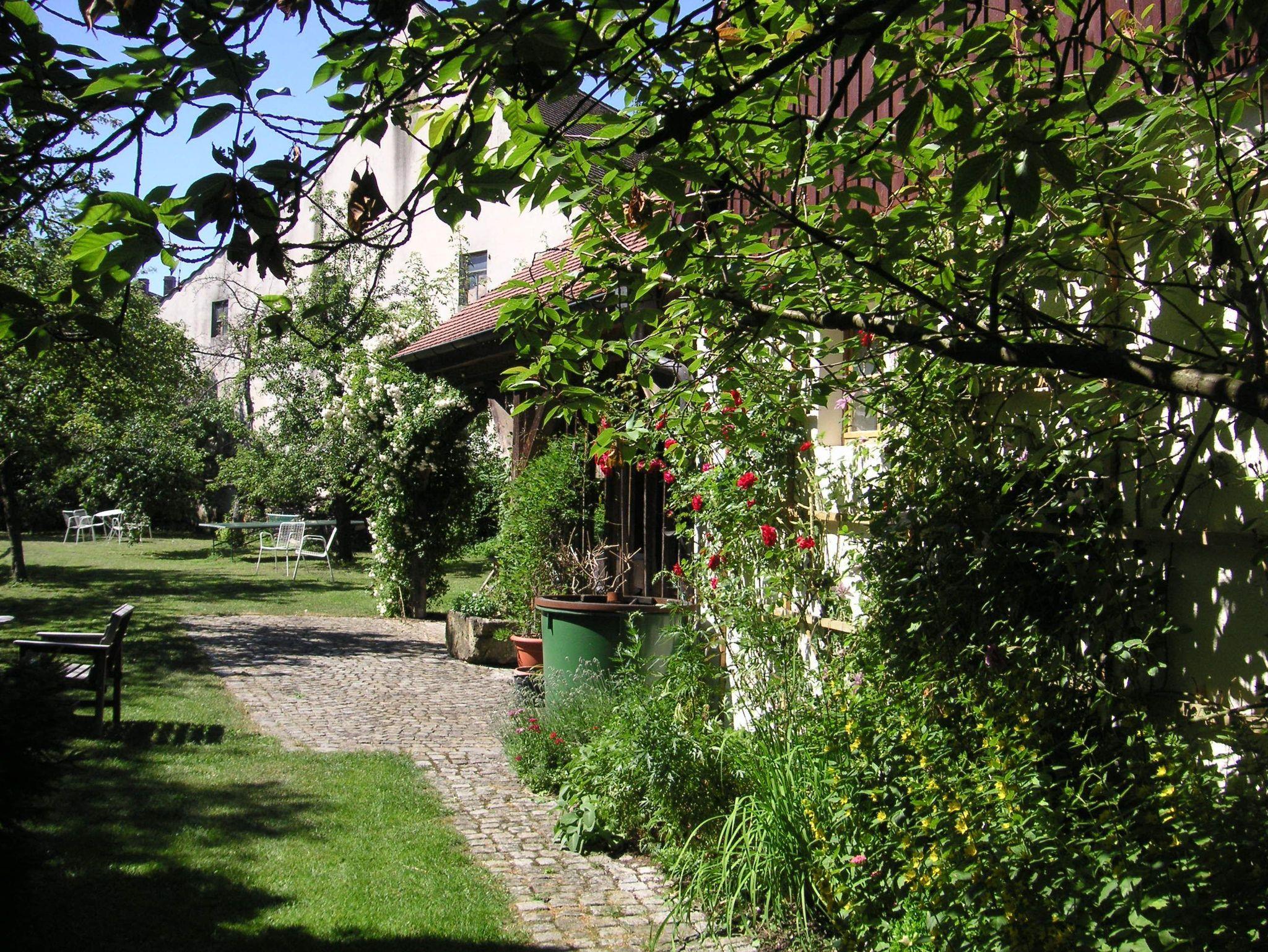 Die Ferienwohnung liegt in einem separaten Nebengebäude im 1. Stock mit grünen Kletterpflanzen von den Außenwänden bis auf das Dach.