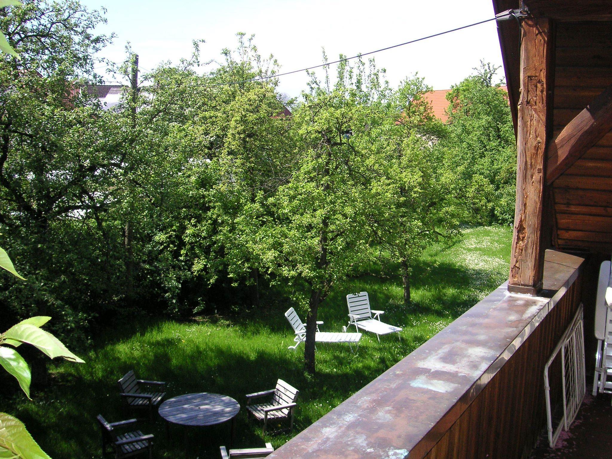 Das große Wohnzimmer erhält seinen Pfiff durch die Komplett-Verglasung der Giebelwand; der vorliegende Balkon ist überdacht, somit lässt er sich eigentlich bei jedem Wetter bedenkenlos nutzen. Gartenblick ! Einrichtung: originale Bauernmöbel nicht nur im Wohnbereich (z.B. gemütlicher Ohrenbackensessel, Holztruhe und ein Schrank von 1860).