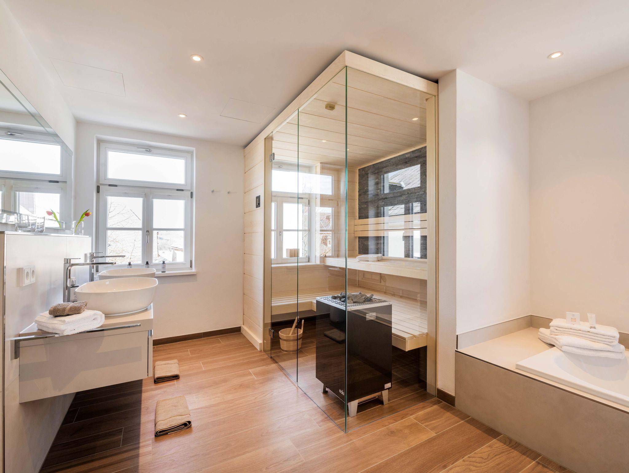 Luxuriöses Design-Bad mit Doppelwaschbecken, Rainshower-Dusche, Badewanne und eigener großzügiger Sauna