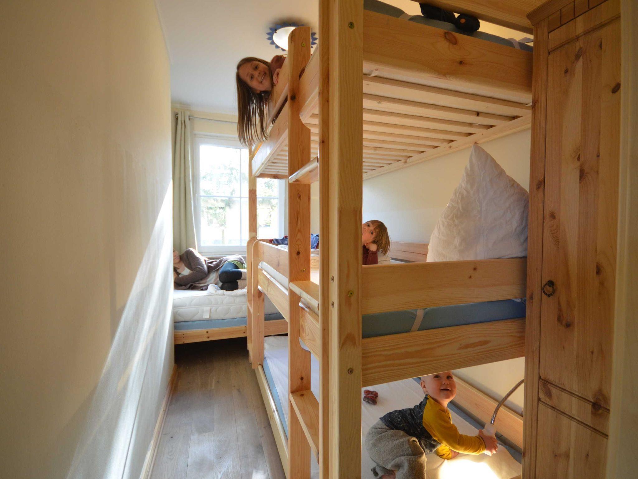 • Schlafzimmer 2 ist mit 1 Dreier-Etagenbett (massiv und daher auch für Erwachsene geeignet mit jeweils 90 x 200 cm) und 1 Einzelbett ausgestattet. Das Fenster ist mit einem Verdunklungsvorhang ausgestattet. 1-türiger Kleiderschrank aus Massivholz.