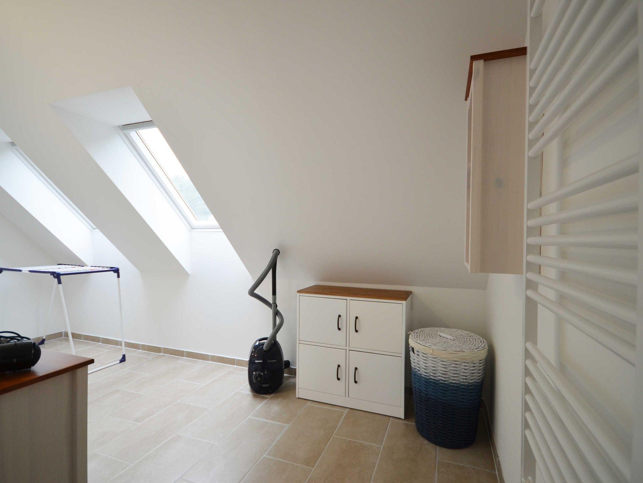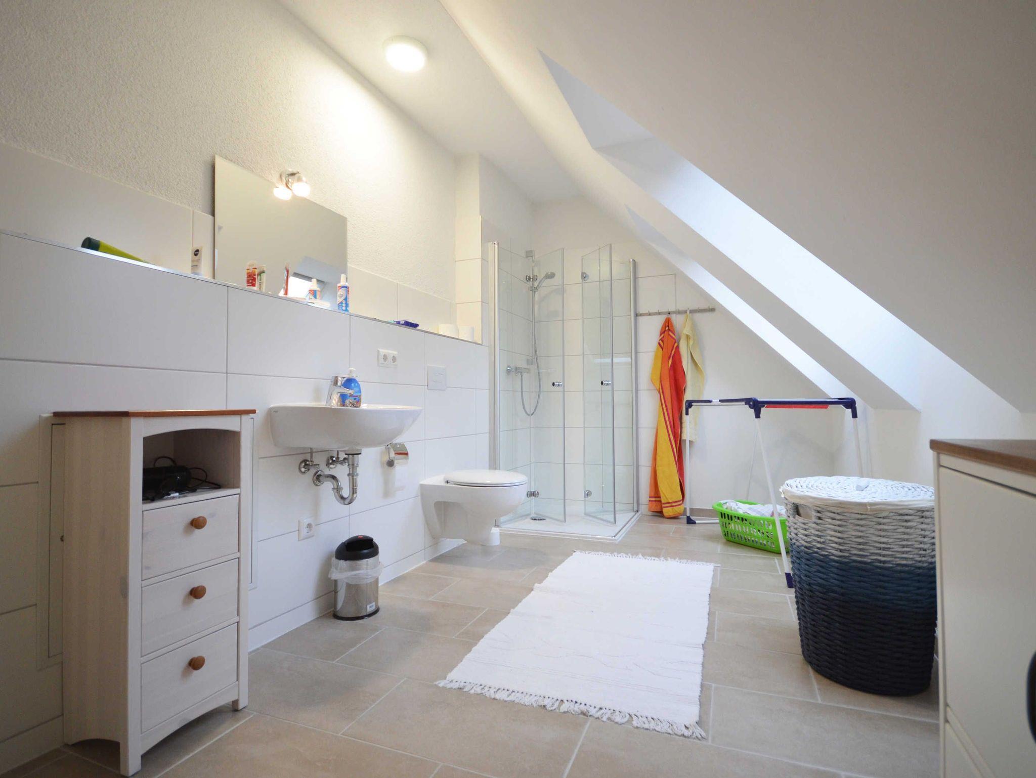 • Im Bad (1. Etage) befindet sich die Dusche, Waschbecken, Toilette und ein Handtuchheizkörper.
