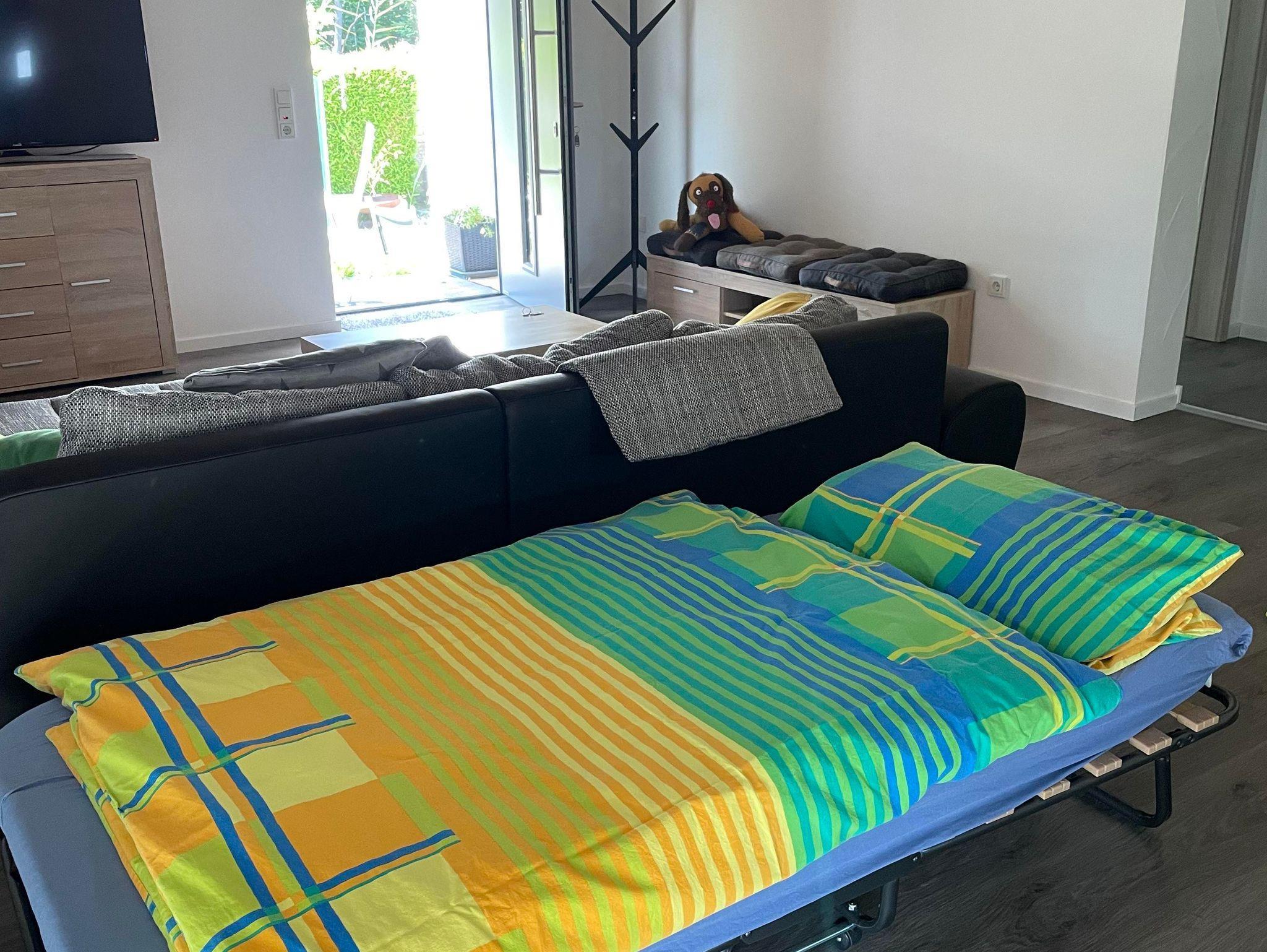 Das große, modern und gemütlich eingerichtete Wohnzimmer mit ausziehbarer Eck-Schlafcouch und separatem Schlafsofa sowie Flachbild-TV lädt zum Verweilen und Chillen ein. Von hier aus ist der direkte Zugang zu Terrasse und Garten möglich.